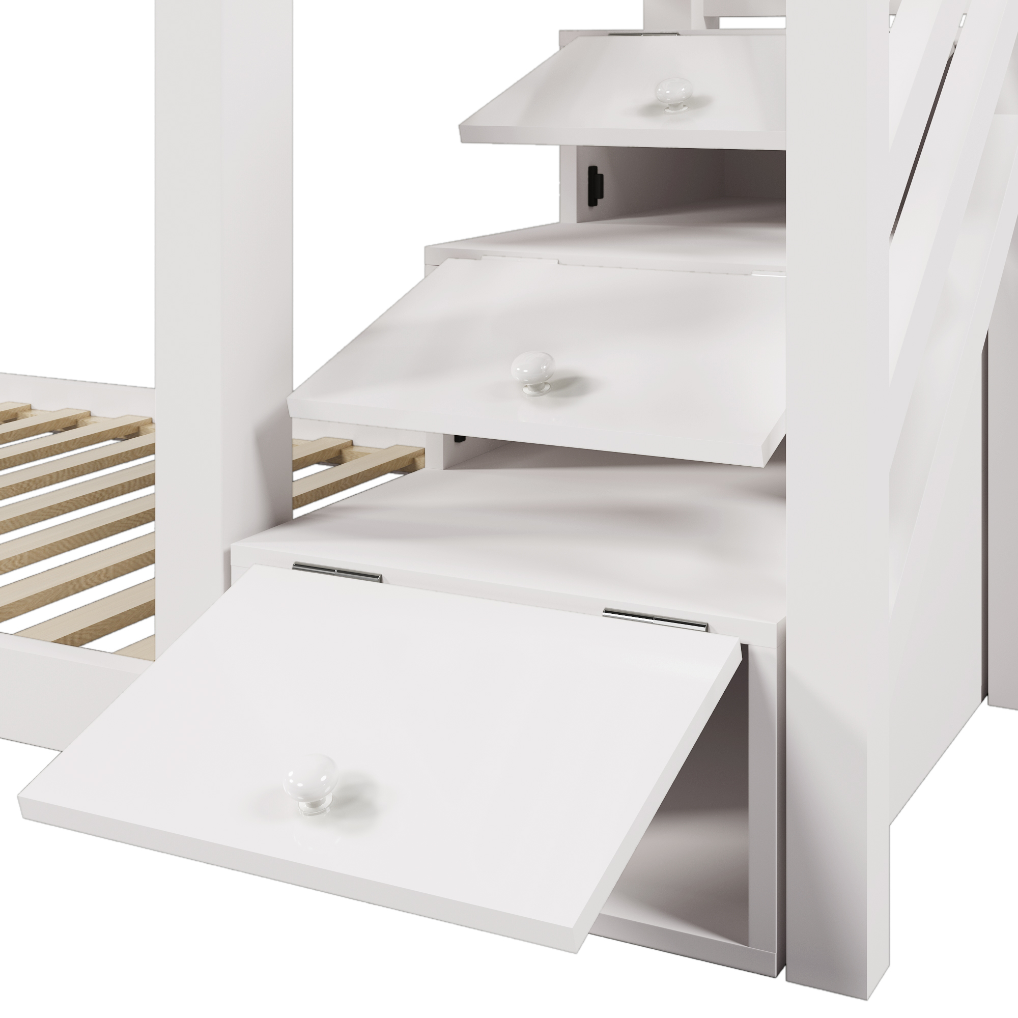 Недавно спроектированный шкаф с лестницей для хранения: три боковые лестницы служат как по лестнице, после чего ребенок может лечь спать, и в качестве шкафов с разными глубинами для хранения игрушек и повседневных предметов ребенка. Шкафы имеют грибные ручки, чтобы облегчить открытие, а открытие снизу вверх позволяет открывать двери шкафа, не занимая места для хранения или ширины лестницы, и в то же время более долговечны, чем оригинальный