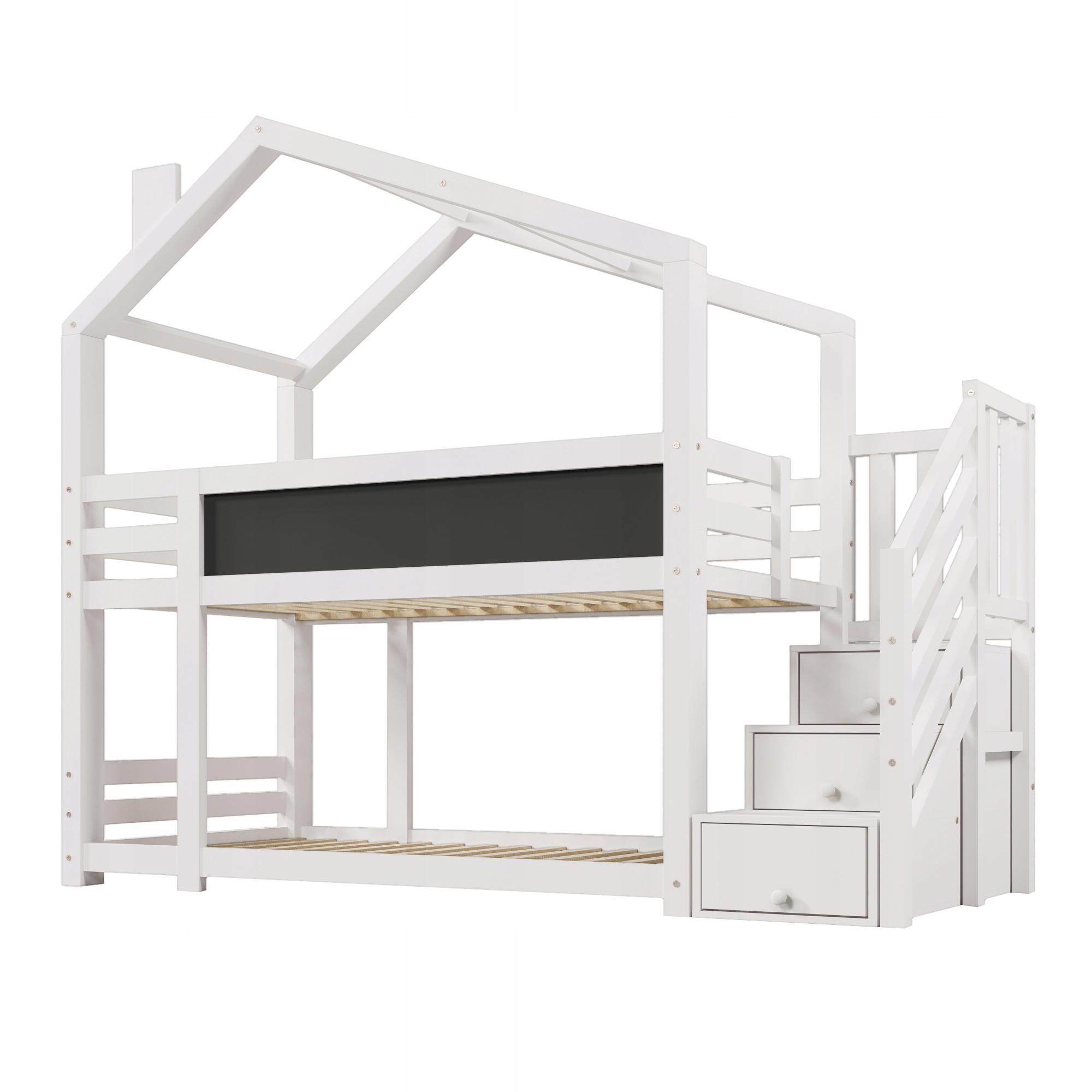 Детская кровать - коттедж на дереве 90 х 200 см, двухъярусная кровать для детей с камином и хранением, и падение с падением, белая, доска в наборе - 2 -кратные рамки с планками (без матраса)
