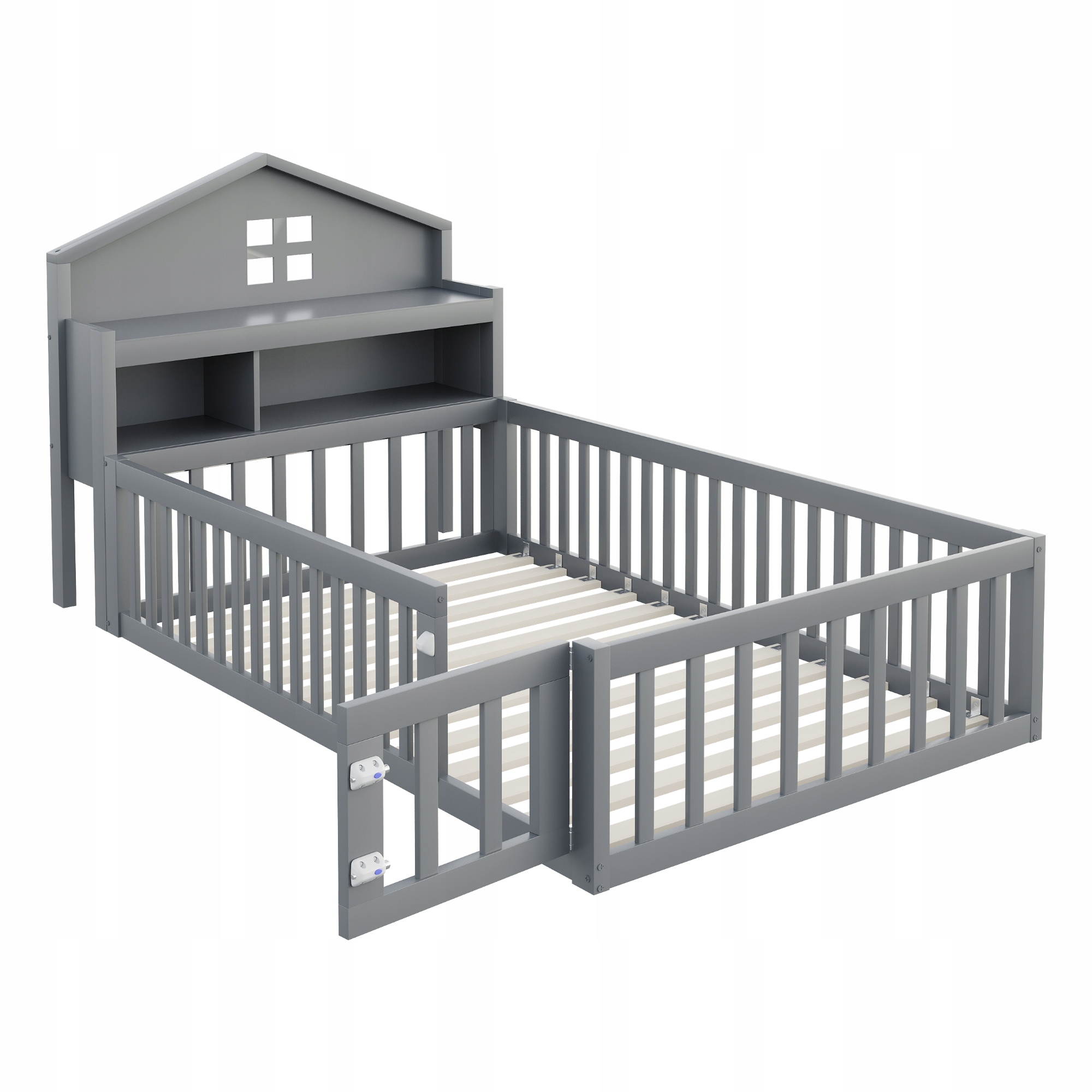 Детская кровать 90 x 200, рамка сплошной деревянной кровати, перила, с полками и пространством для хранения, с защитными воротами и дверью, с ремесленной полосой, с полосатой рамой, серым цветом