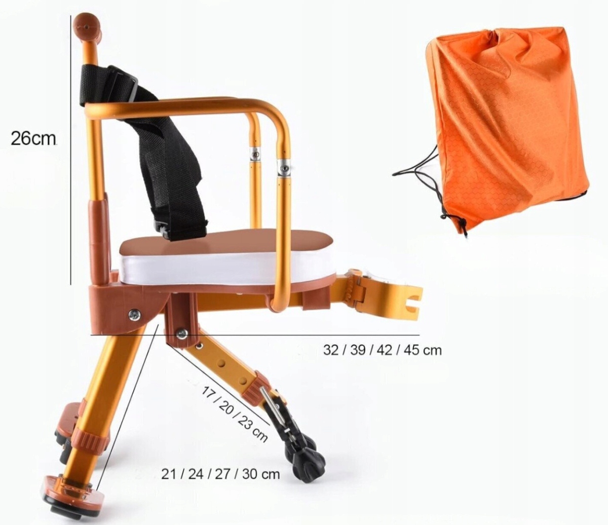 Бренд: XIEEIX Модель: ZD002 Тип: Передний Материал: алюминий, губка, полиуретан, пена. Максимальная нагрузка: 25 кг. Подходящий возраст: от 1 до 4 лет. Расстояние между передним краем сиденья и рулем: ≥35 см. Дополнительные особенности:Мягкая подкладка, регулируемая подставка для ног, водонепроницаемое сиденье. Поддерживаемые типы велосипедов: гибридные велосипеды, велосипеды для фитнеса, велосипеды Cruiser, складные велосипеды, городские велосипеды. Стандарты безопасности и сертификаты: CE. Ширина между подлокотниками: 27 см. Регулируемая длина переднего кронштейна: 17/20/23 см. Регулируемая длина основного кронштейна: 32/39/42/45 см. Регулируемая длина опоры для ног: 21/24/27/30 см. Размеры подушки: 22 x 19 x 3 см. Размеры сиденья: 27 x 26 x 32 см (в сложенном виде) Вес: 2 кг. Цвет: золотой, коричневый, белый