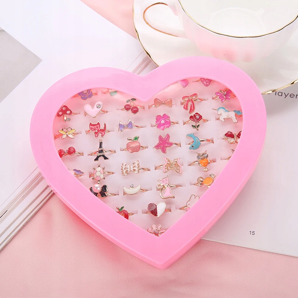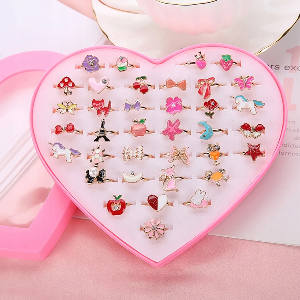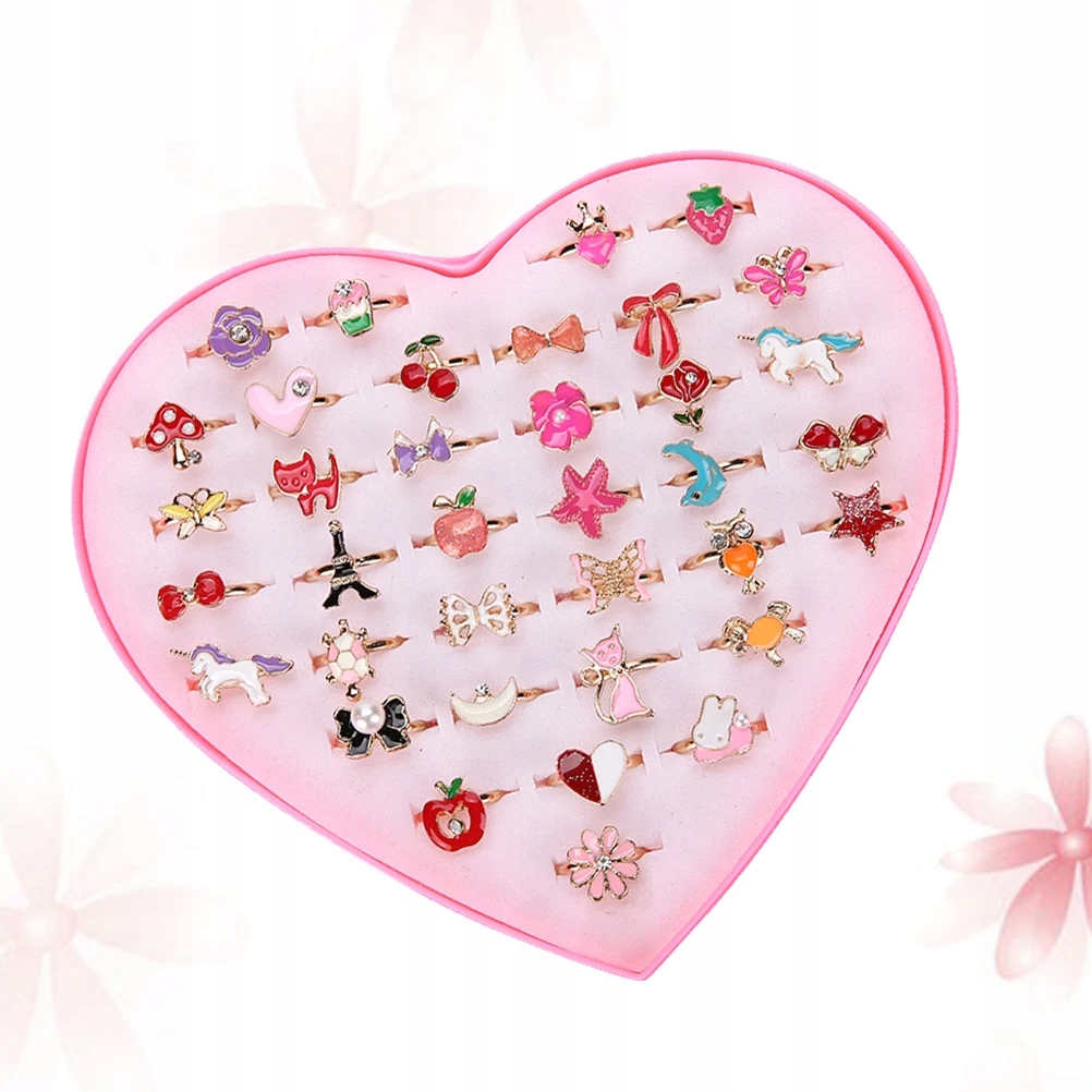 Дизайн сплавных колец с 36 частями, которые заставит ваших детей загипнотизироваться. Сердце, бабочка, цветок и многие другие красочные дизайны с бриллиантом, очень красивые. Он может быть использован в качестве залегания для сумок на день рождения с подарками, соснами, притворяющимися, что играет с чаем, карнавалом, коробкой сокровищ и не только
