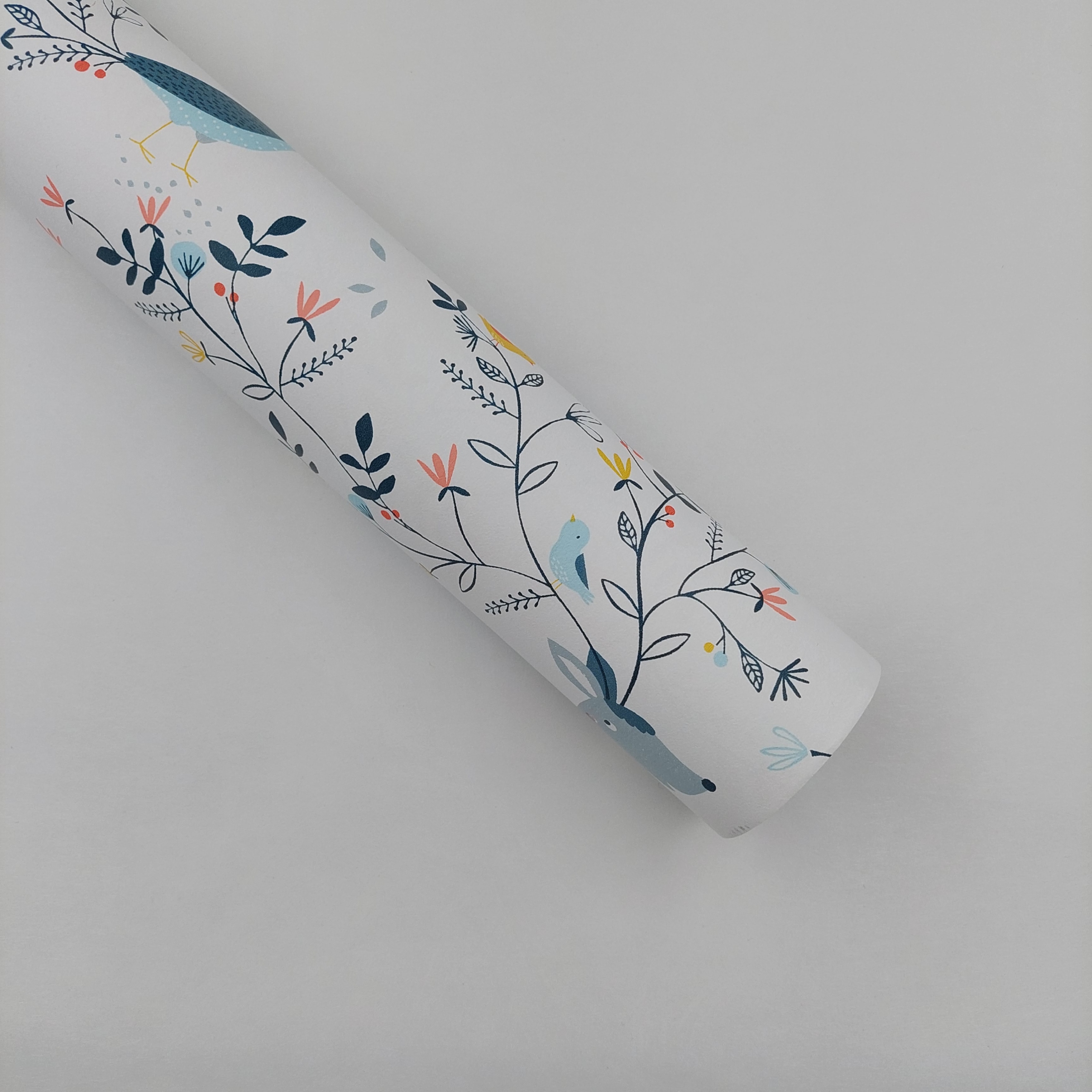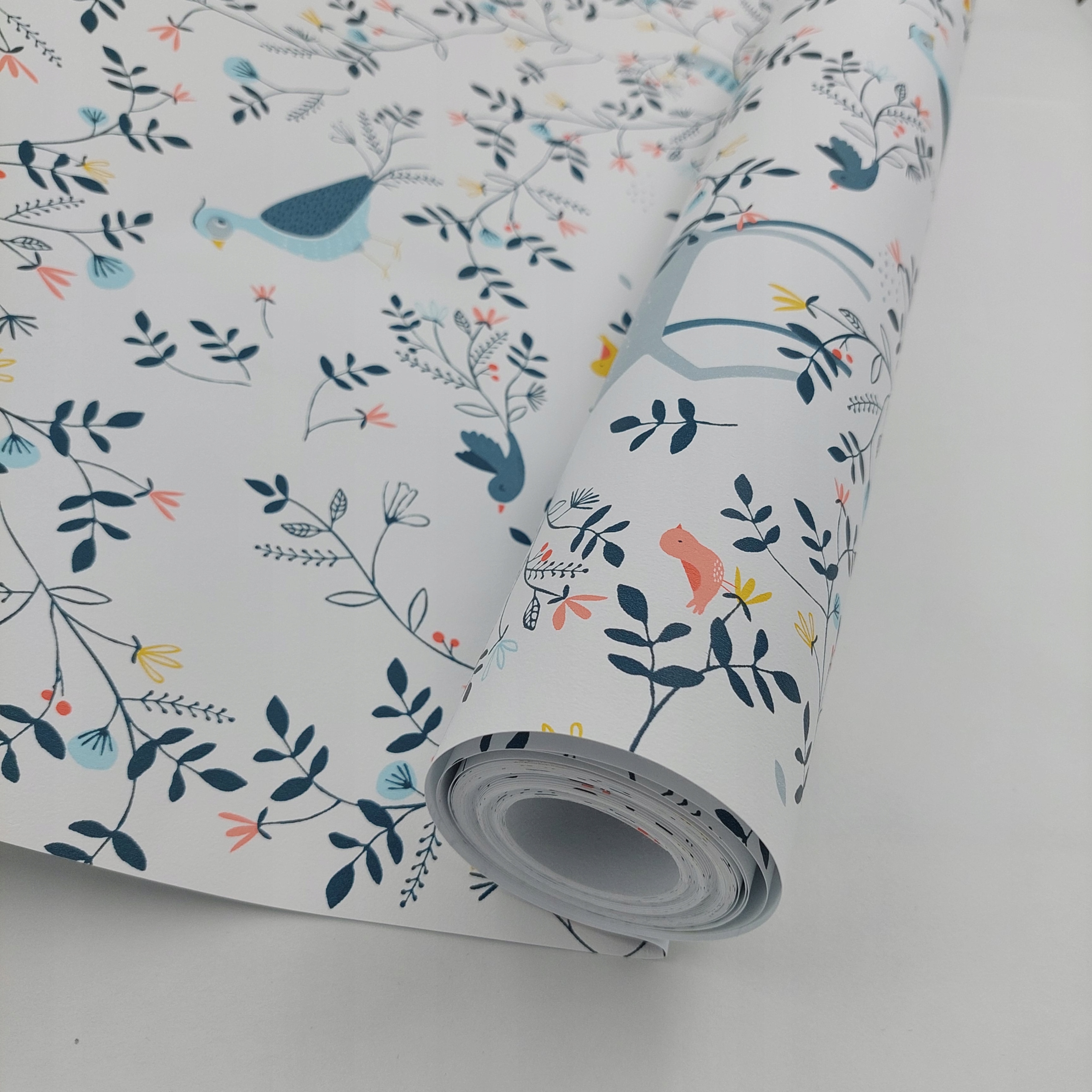 Современные обои с изображением разноцветных лесных животных с листьями и цветами на гладком белом фоне