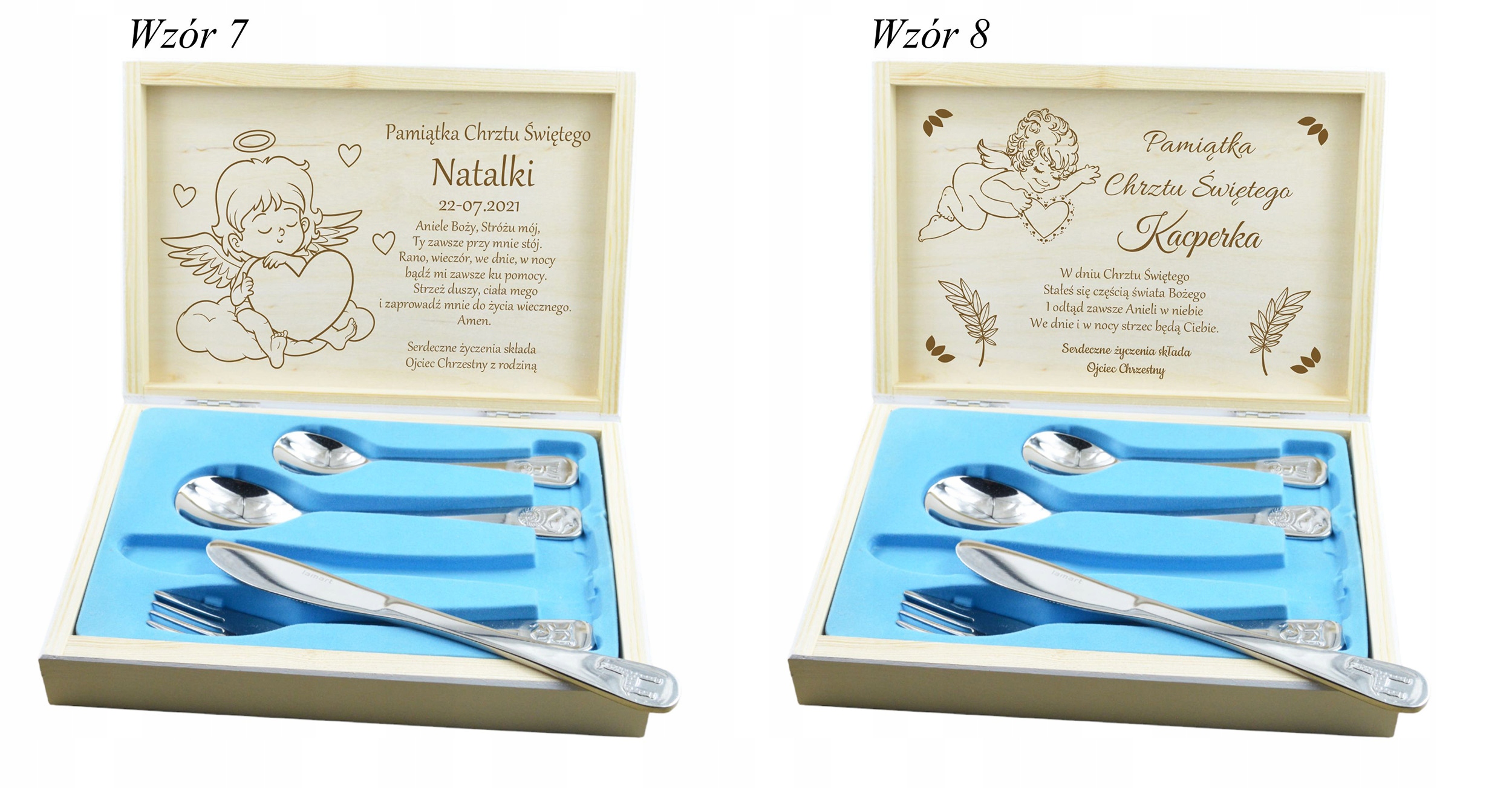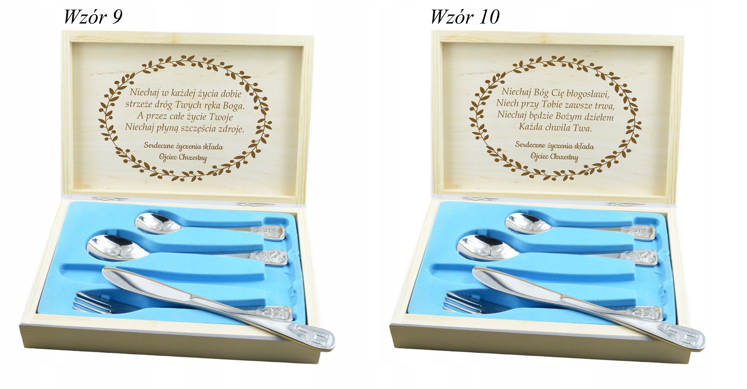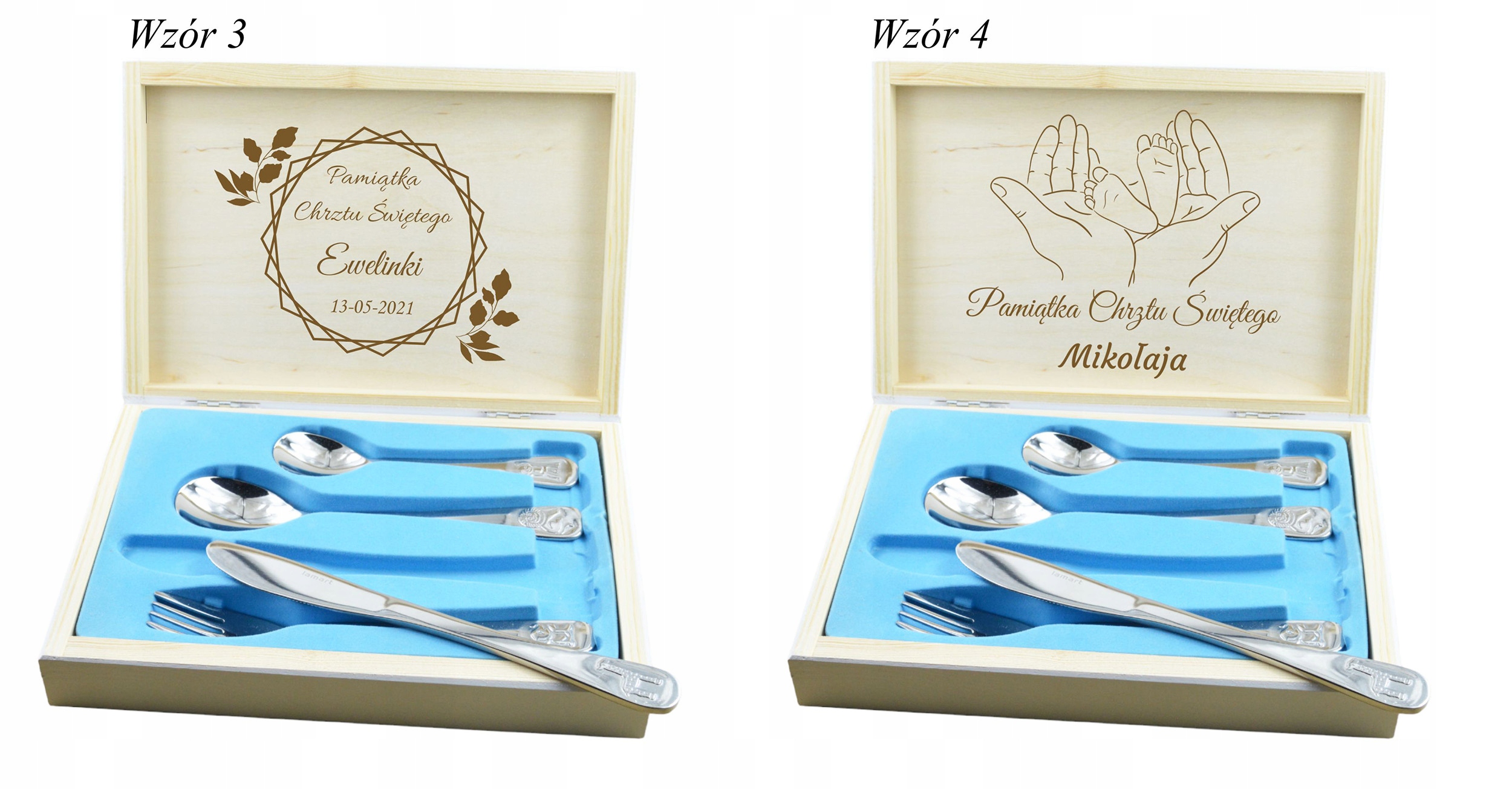 Столовые приборы для детей, помещенные в деревянную коробку, - интересная идея подарка на крещение или день рождения. Элегантный дизайн коробки с печатным рисунком и индивидуальной гравировкой станет идеальным подарком на крещение. В комплект входят качественные вилка, нож, ложка и чайная ложка. Декоративные столовые приборы для детей станут приятным дополнением к трапезе даже самому привередливому едоку. Дополнительно мы можем выгравировать на всех элементах указанную вами гравировку – например, имя вашего ребенка. Внутри коробки мы можем выгравировать индивидуальное посвящение по шаблонам, подготовленным ниже.