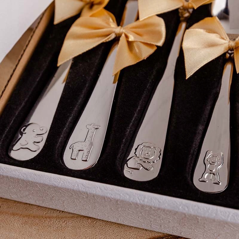 - Состав: серебряные детские столовые приборы из нержавеющей стали с гравировкой животных (набор из 4 штук), перевязанные золотыми бантиками и помещенные в коробку из плотного картона с интересной фактурой; на коробке имеется специальная наклейка с графикой и персонализацией; шкатулка перевязана золотой лентой.