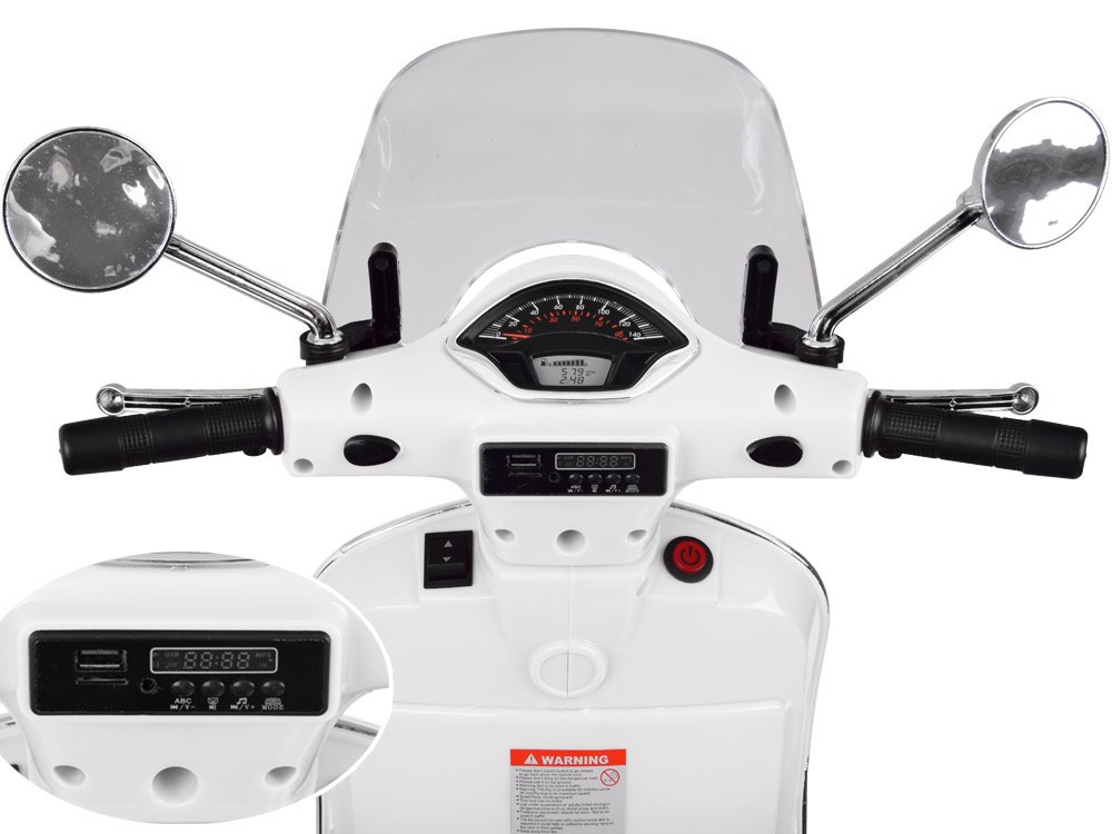 Самокат имеет переднее и заднее освещение, что делает вид автомобиля еще более реалистичным. Как и положено двухколесному транспортному средству, мотоцикл оснащен спидометром (пустышной наклейкой), который еще и имеет подсветку! Дополнительно у Vespa есть обтекатель и боковые зеркала (манекены). Благодаря продуманным деталям ваш ребенок сможет почувствовать себя настоящим водителем!