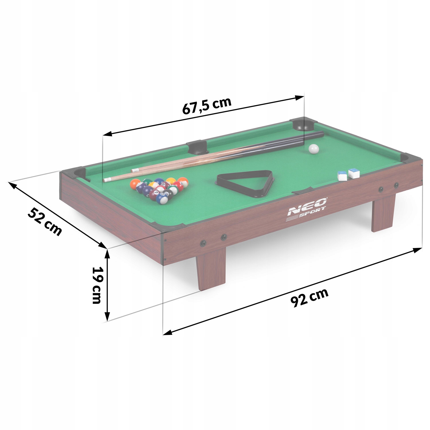 В комплект также входят все необходимые аксессуары: 2 кия, 16 шаров, треугольник и 2 бильярдных мела. .