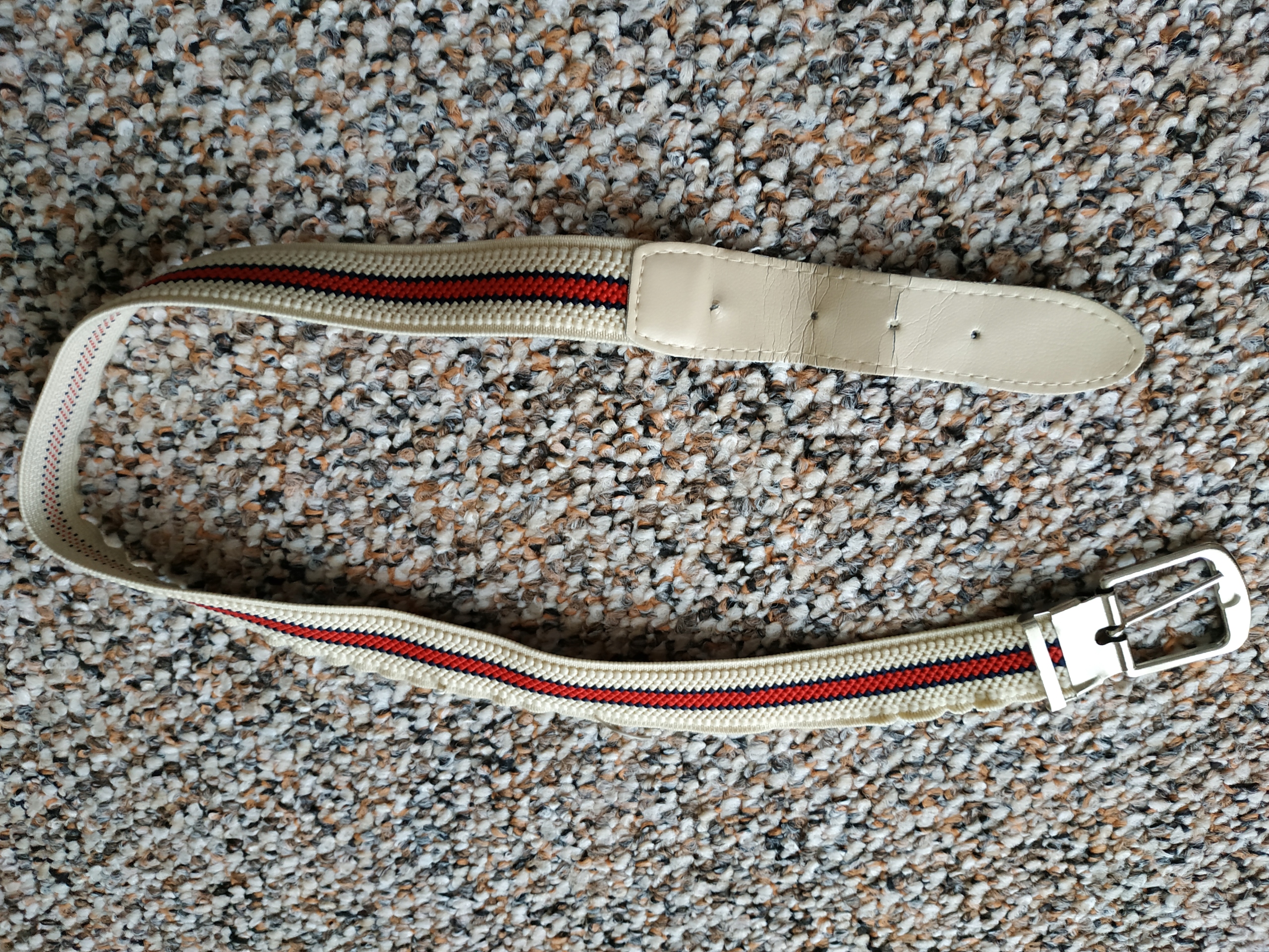 Детский ремень с регулировкой длины. Изготовлен из прорезиненного полиэстера цвета экрю с красно-черной полосой посередине. Застежка из эко-кожи цвета экрю. Застежка из серебристого металла. Возраст 3+. Общая длина 67 см без растяжки. Ширина 2,5 см. Ремень универсальный и практичный. Его длина легко регулируется от 58 см до 72 см в застегнутом состоянии. Хорошее состояние.