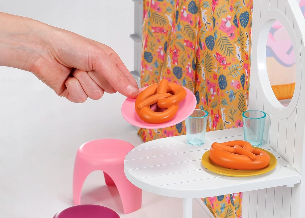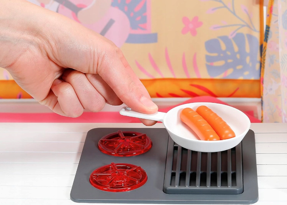 ✔ Многие аксессуары включены в набор: в дополнение к розовому матрасу и подушке, есть много удовольствия для игры вокруг лагеря, включая 2 стулья, посуду, горшки, крендели и колбасы