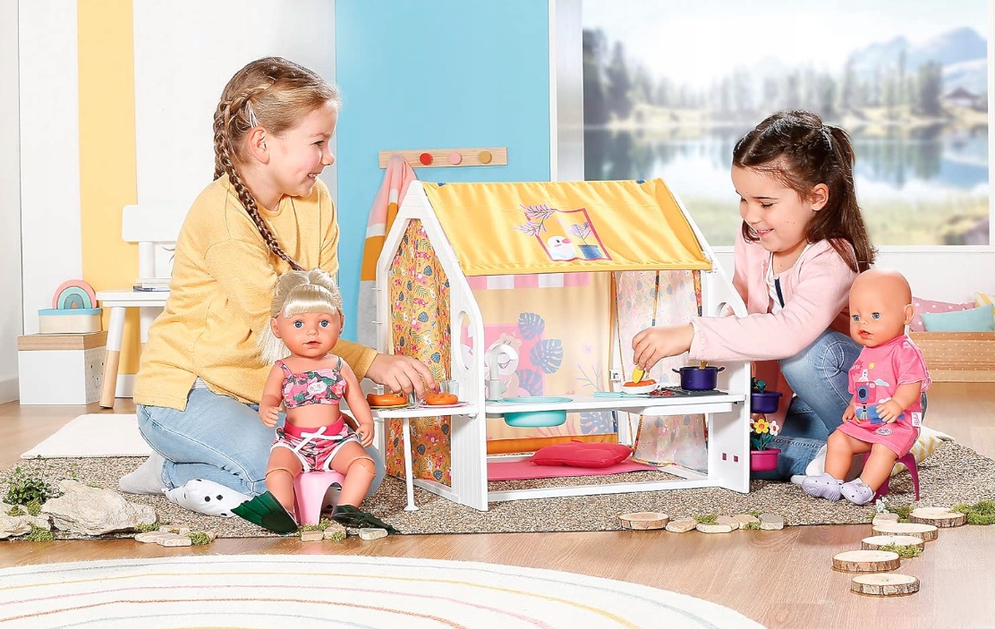 Дом выходного дня, родившийся в детстве, - это интерактивный кукольный домик, который предоставит вашему ребенку много часов удовольствия. Сделанный известным брендом, рожденным ребенком, в доме есть много световых и звуковых эффектов, в том числе раковина с шумом воды, кухонные тарелки, гриль с легкими и посевами, и боковые панели, которые могут быть свободно открыты или закрыты. Обширный набор кемпинга, в том числе 2 стулья, посуду, горшки, крендели и колбасы, предоставит вашему ребенку много удовольствия от куклы