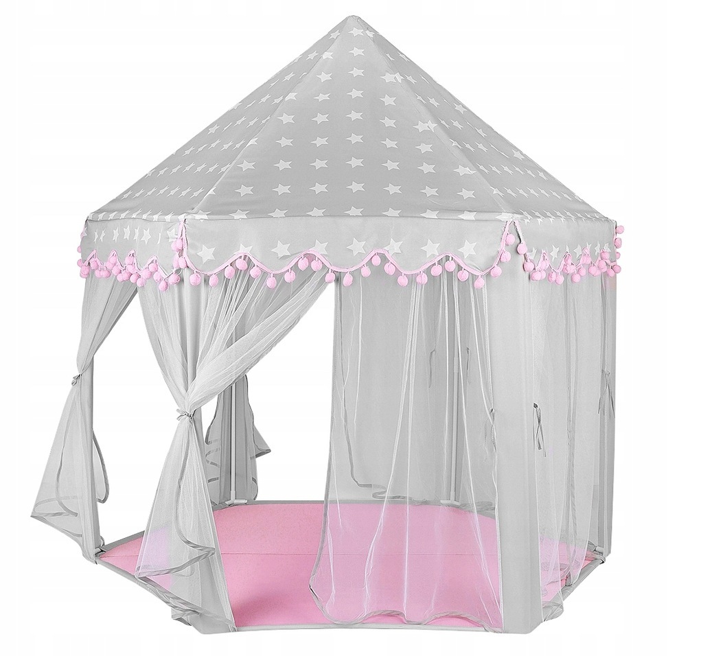 Предлагаем совершенно новую, улучшенную модель палатки. Мы использовали сочетание розового и серого цветов со звездным мотивом на крыше. Дополнительно на рюшах есть красивые розовые помпоны, которые делают ее еще более привлекательной.