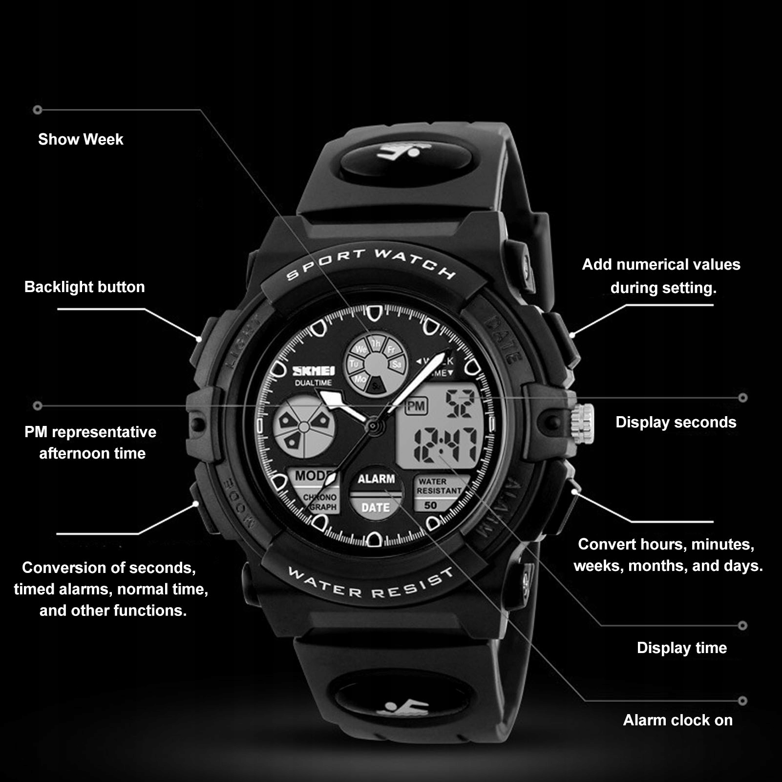 1. Водонепроницаемые часы: водонепроницаемость 164 фута/50 метров, ручная стирка, плавание, без проблем! Однако не нажимайте какие-либо кнопки в воде и не носите эти часы при длительных занятиях под водой, например при дайвинге.
