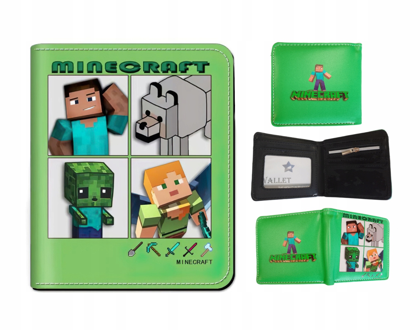 Спереди украшены четыре знаковых персонажа из Minecraft — Стив, Алекс, зомби и волк — на характерном зеленом фоне с надписью и значками инструментов. Этот забавный дизайн сочетает в себе приключения и креативность мира Minecraft и превращает повседневное использование кошелька в удовольствие.
