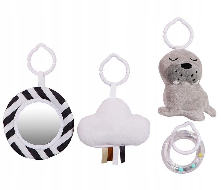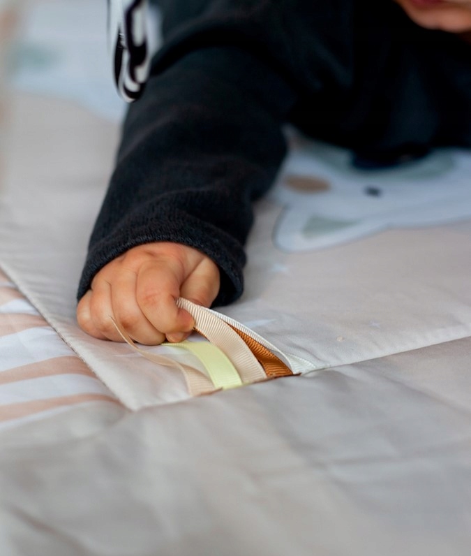 Игровой коврик имеет две арки, к которым прикреплены четыре игрушки. Погремушка, пищащая игрушка, мягкая игрушка и зеркало займут вашего малыша. Дополнительно игровой коврик оснащен пищалкой и бирками. Игровой коврик также очень практичен! Когда ваш ребенок закончит играть, боковые стороны можно сложить внутрь и закрепить завязками! Все игрушки можно поместить в сумку, а сумку можно легко хранить или переносить за ручки, например, бросить в багажник, собираясь на выходные в гости к бабушке и дедушке.