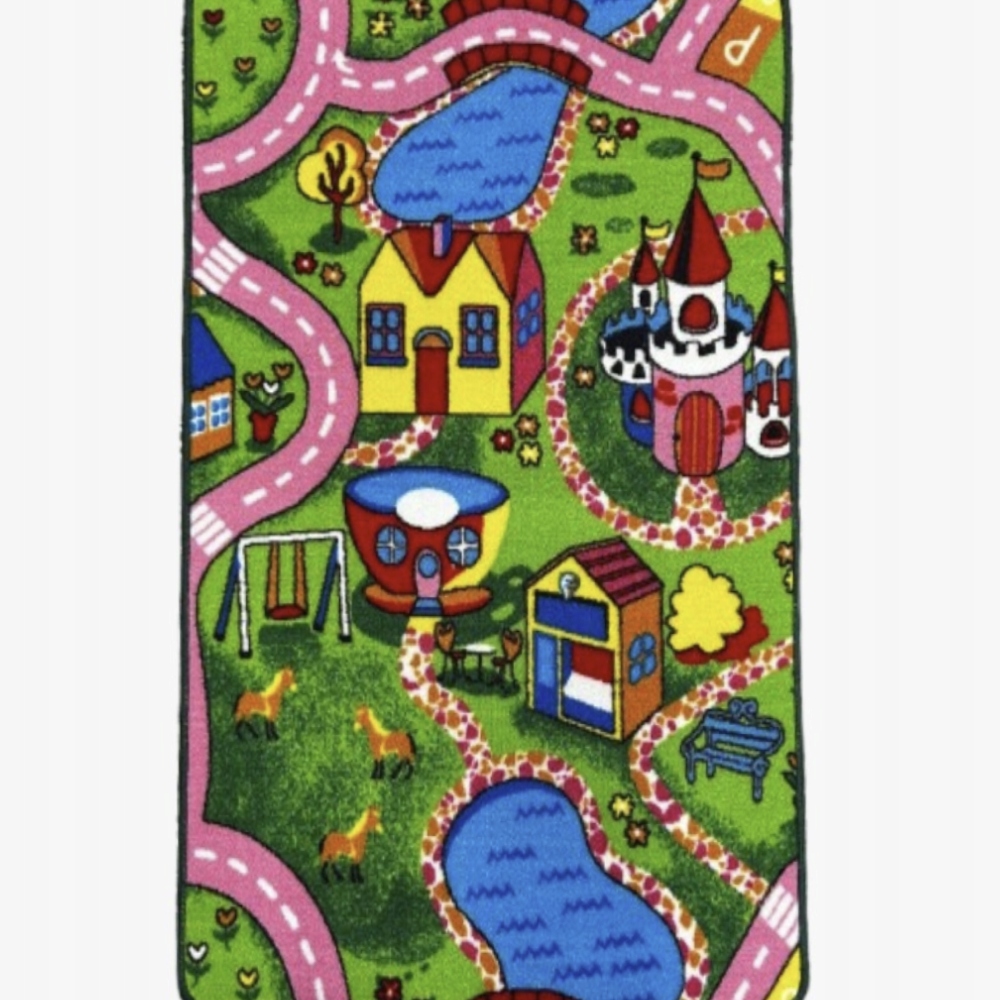 Детский ковер с мотивом сказочного города — идеальное место для игр и развития детского воображения. Красочные дома, замок, детская площадка, лошади, пруды и аллеи создают красочный пейзаж, который побуждает вас создавать свои собственные истории и разыгрывать сценки. Это не только декоративный элемент, но и прекрасное место для игр в безопасных и комфортных условиях.