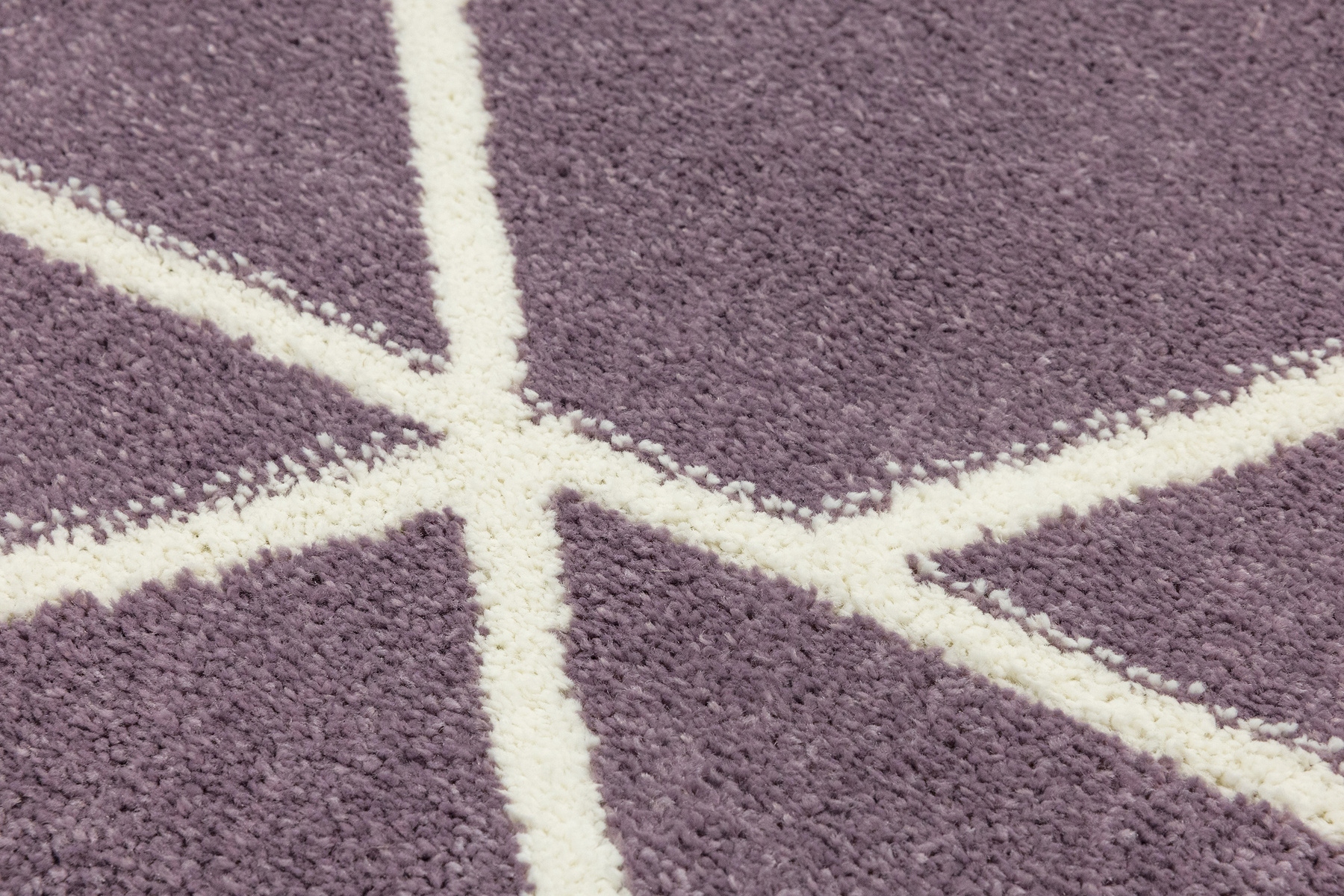 Современный ковер Lima с мягким блестящим ворсом с геометрическим узором в фиолетовых и кремовых оттенках, с джутовым низом.