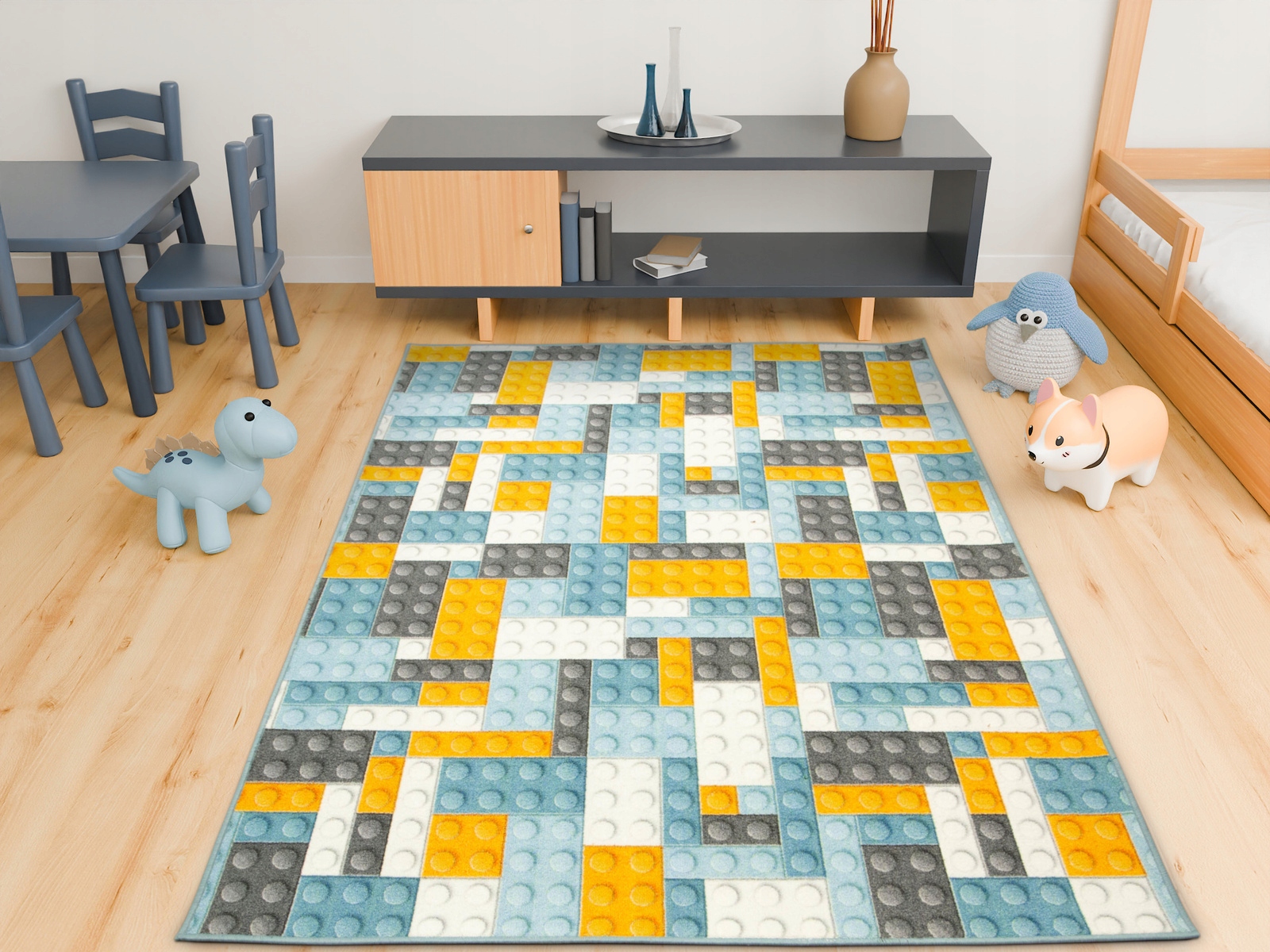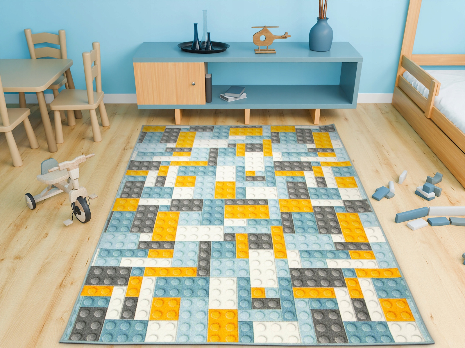 Причудливый узор, напоминающий разноцветные кубики, стимулирует творчество и развивает воображение ребенка. Ковер сочетает в себе гармоничные оттенки синего, оранжевого, серого и кремового, создавая динамичную и радостную композицию.