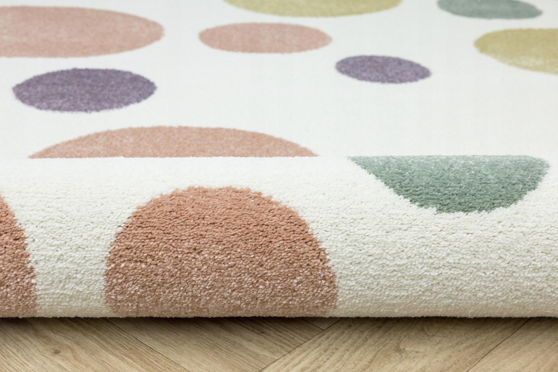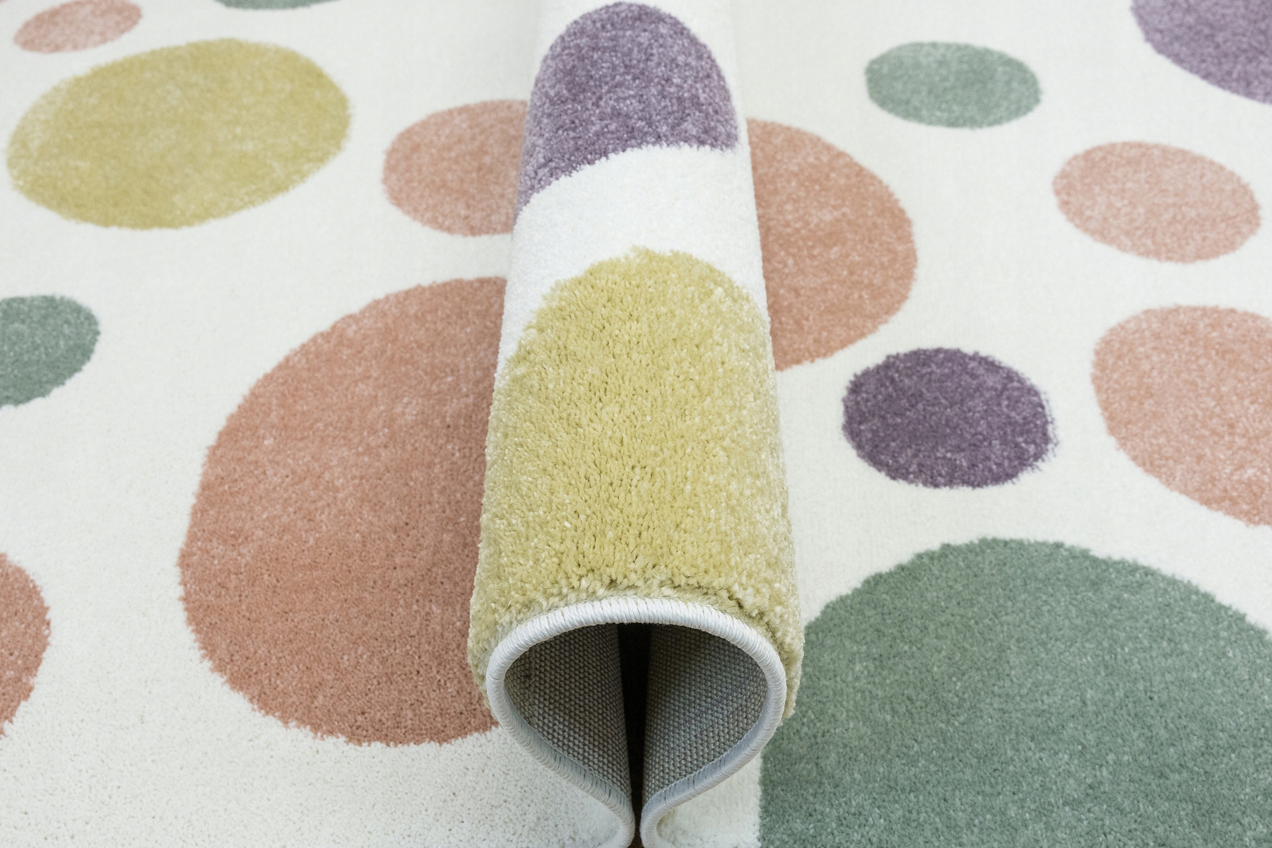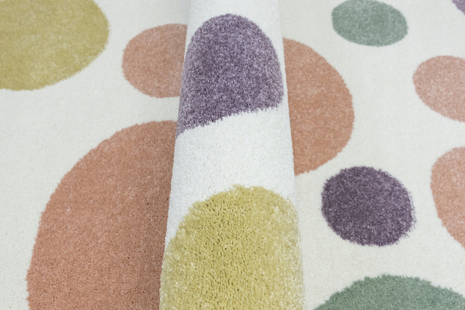Детский коврик Lima из мягкого флиса с узором из точек неправильной формы разного размера кремового, розового, фиолетового, зеленого и желтого цветов.