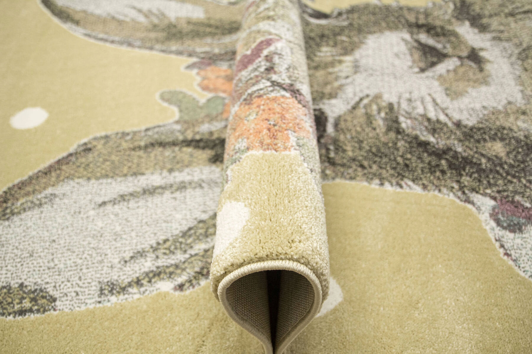 Ковер Лима украшен очаровательным сказочным мотивом с изображением зайца, украшенным венком из ярких цветов. На фоне теплых бежевых и нежно-желтых оттенков можно увидеть тонкие белые точки, которые придают композиции легкость и радость. Цвета сочетают в себе нейтральные оттенки серого, желтого и серого, разбавленные пастельными тонами цветов, благодаря чему ковер идеально вписывается в детскую комнату, привнося уют и тепло.