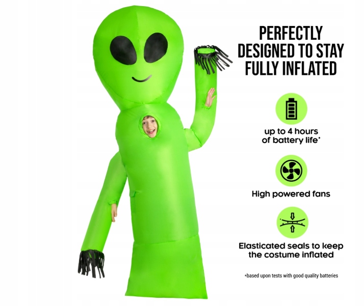 Этот костюм отражает забавный дух инопланетян благодаря яркому зеленому цвету, большим глазам и смешным развевающимся рукам. батареи, чтобы надуть костюм через несколько секунд. Легкий и удобный: