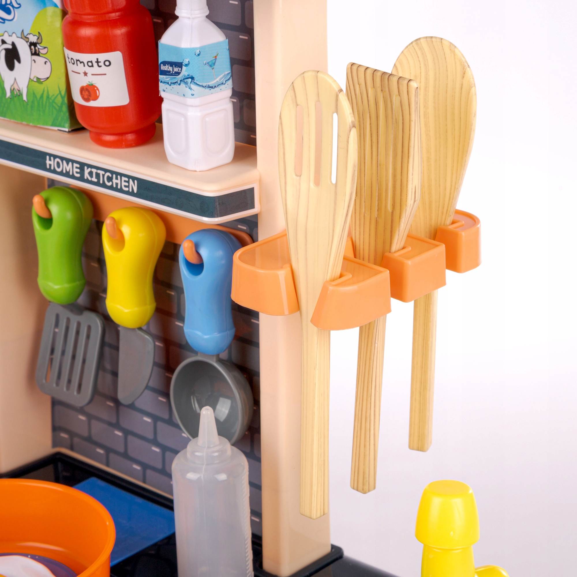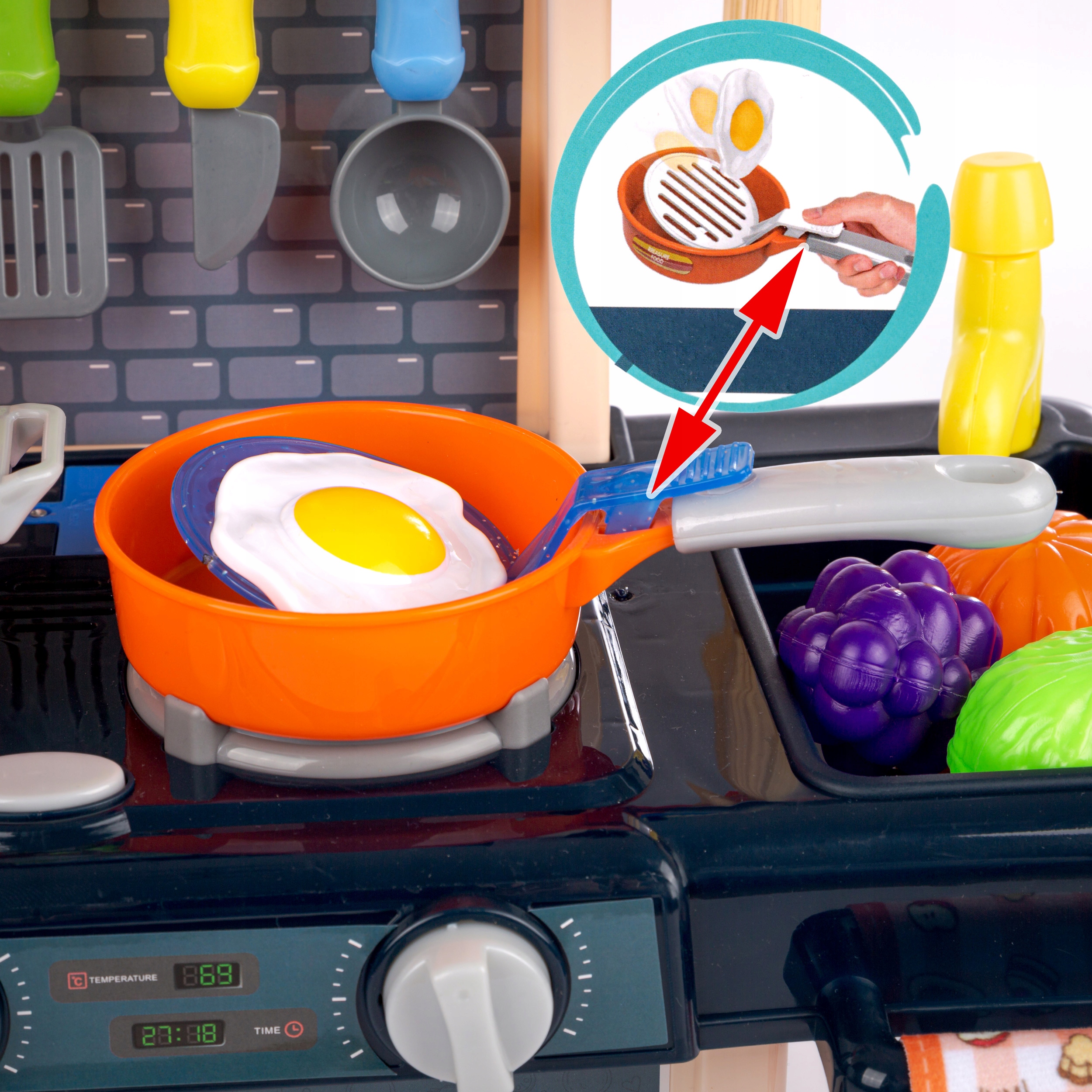 - В комплект входят 42 аксессуара (фрукты, овощи, кастрюли, тарелки, столовые приборы, коробки для продуктов).