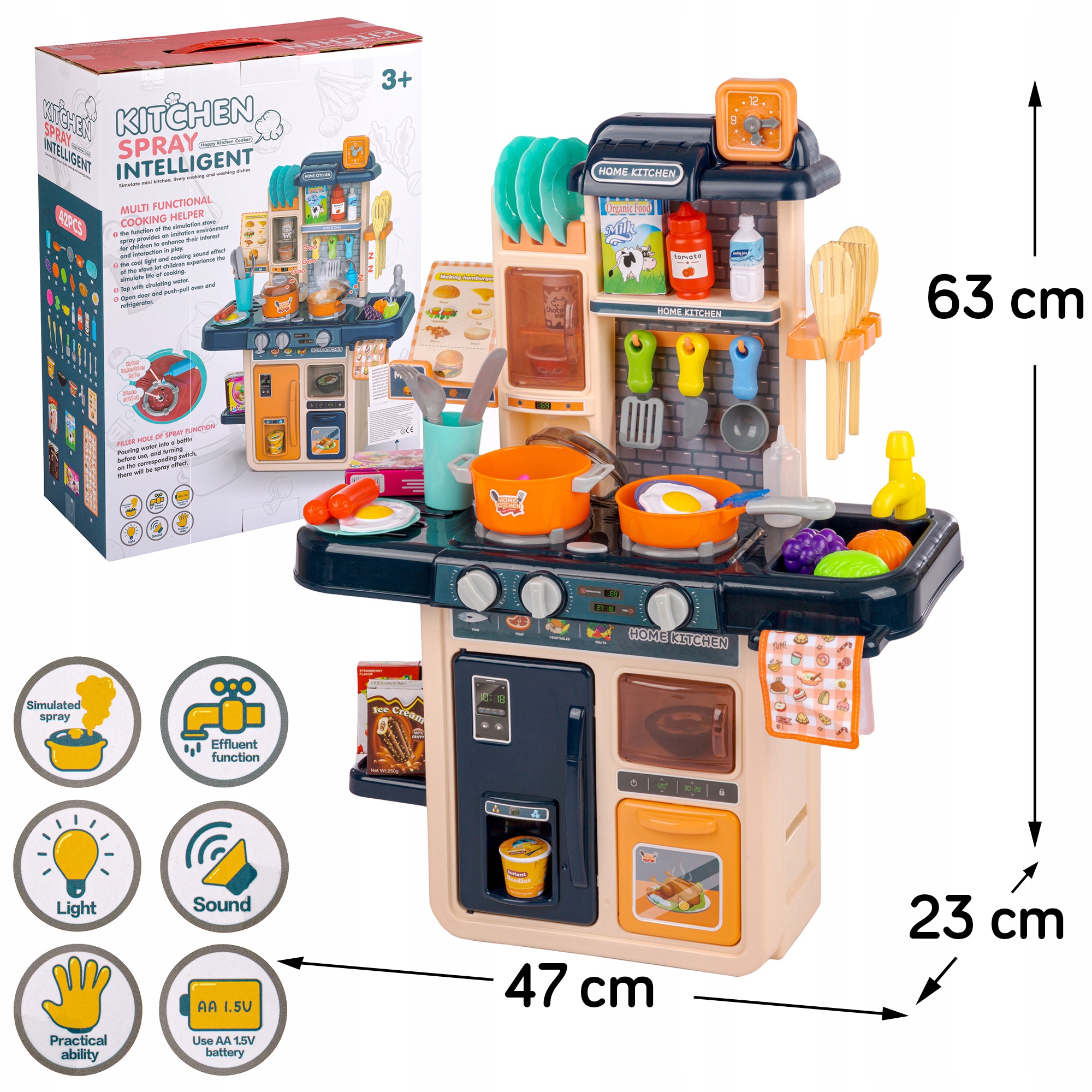 - Размеры кухни: 47 х 23 х 63 см (Ш х Г. >Питание: 3 батарейки типа АА (батарейки в комплект не входят).