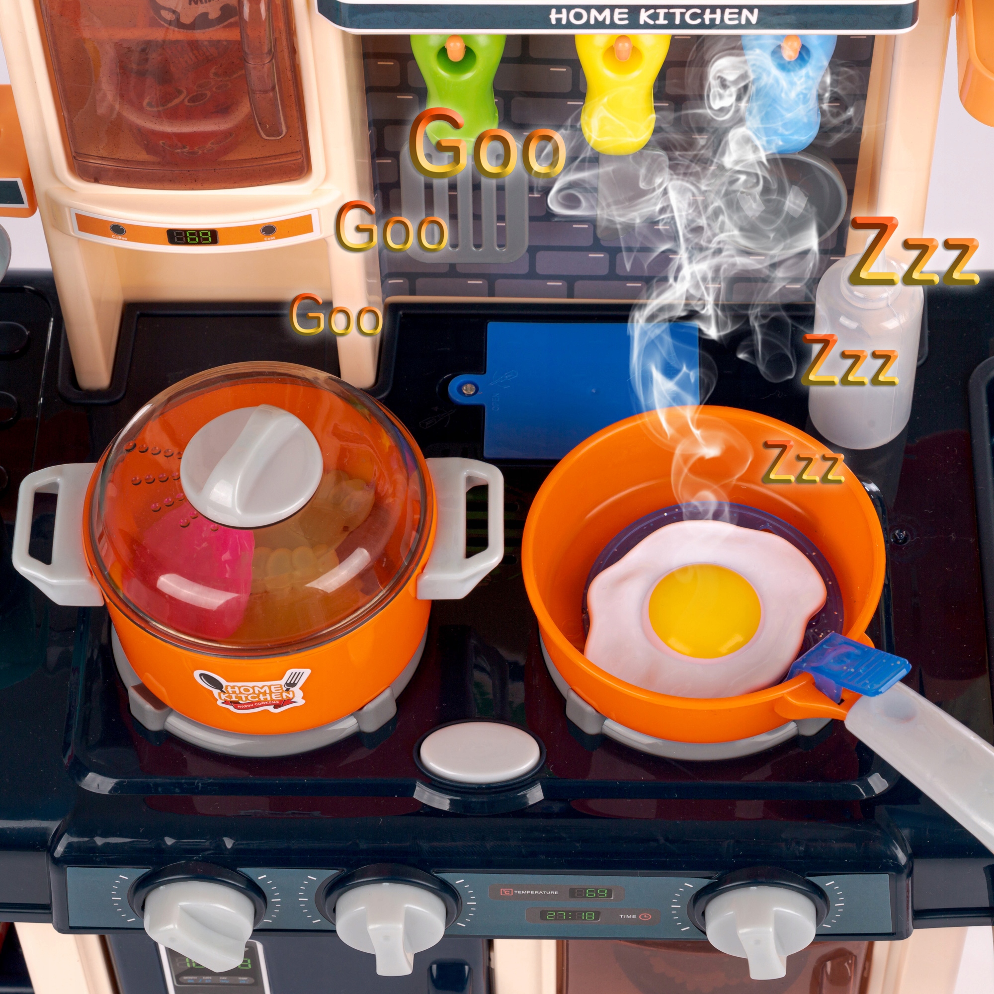 После включения первой ручки включается первая конфорка, горит свет и из конфорки выходит пар, имитирующий дымящуюся воду. Все это сопровождается звуком кипящей воды (пар не горячий, полностью безопасен)