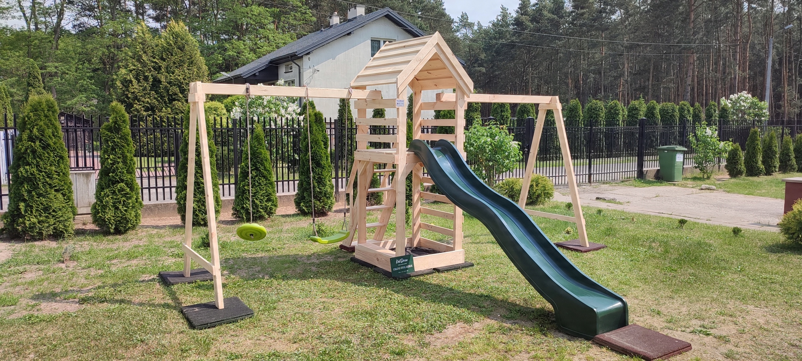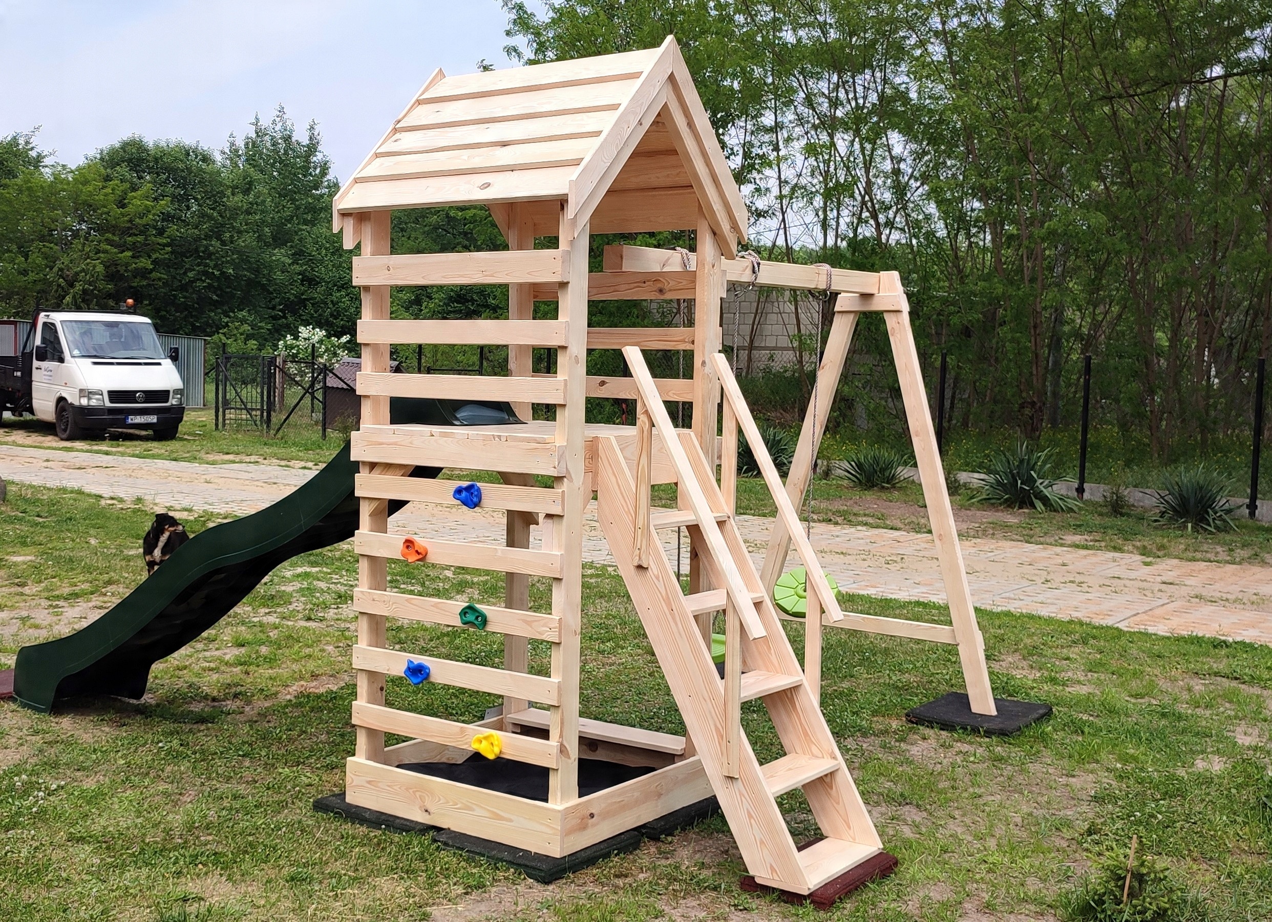 В комплект не входят горка/горка, видимая на фотографиях, камни для лазания и пластиковые качели. Мы не продаем эти элементы, они легко доступны даже в Интернете (аллегро).