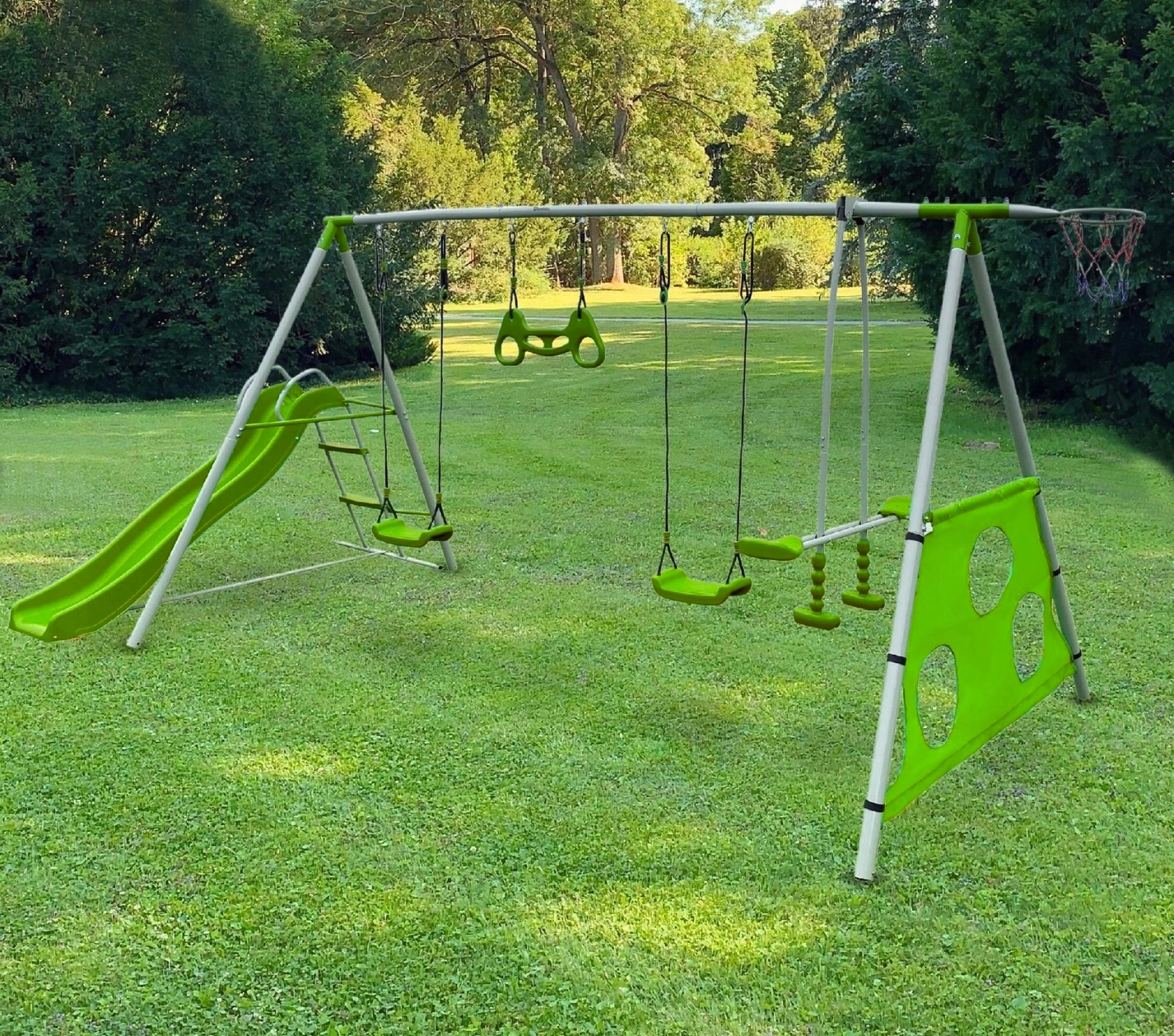 Deluxe Max Playground для сада; Сплошная металлическая структура; сопротивление погодным условиям; 2 качели; гимнастический трапециевид; качаться на двоих; слайд; баскетбольная корзина; для детей 3+; максимум загрузить 90 кг.
