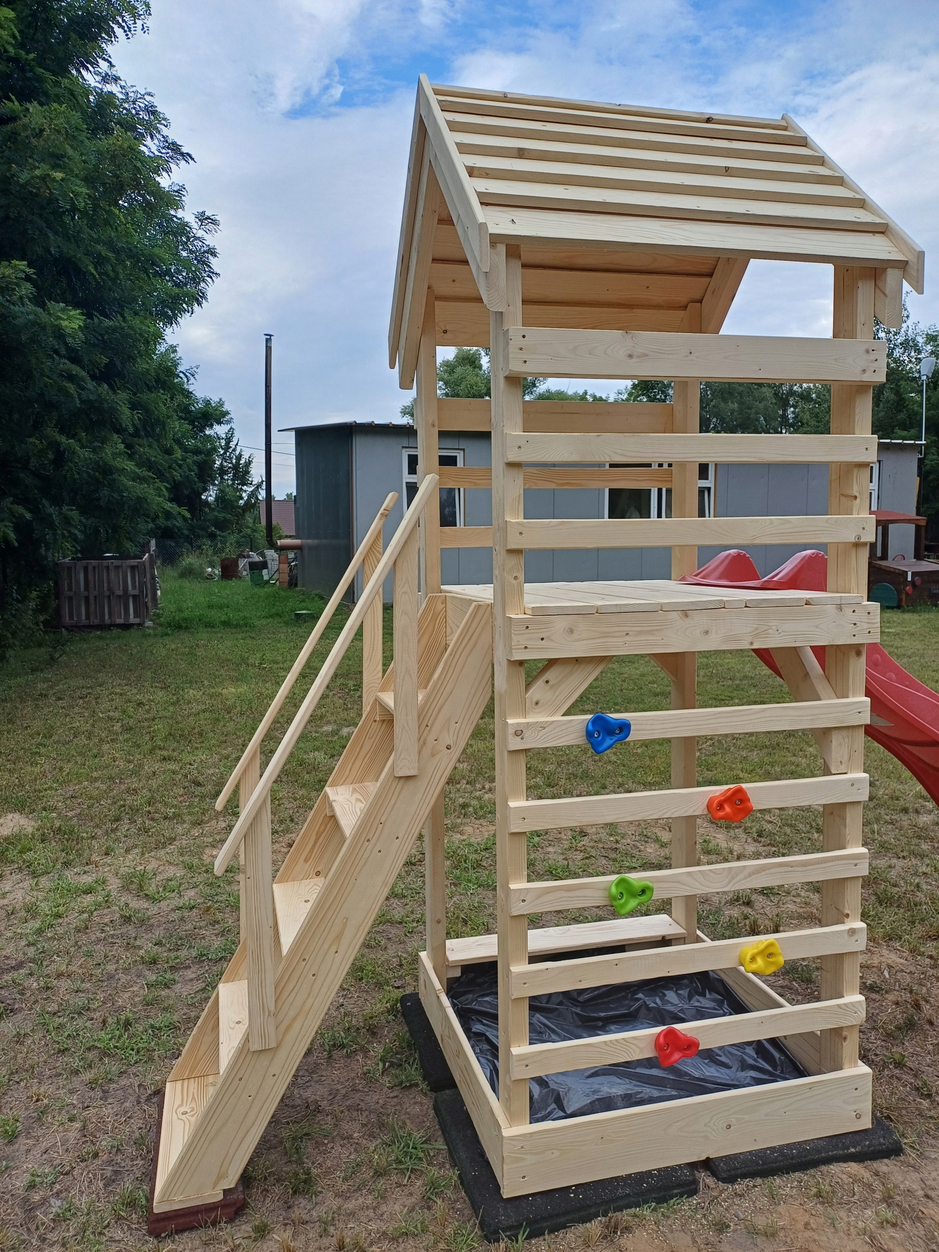 В башне предусмотрено место для песочницы с. скамейка в нижней части, встроенная стенка в качестве платформы для лазанья, безопасные ступеньки с перилами с обеих сторон и площадка, подготовленная для сборки горки/горки.