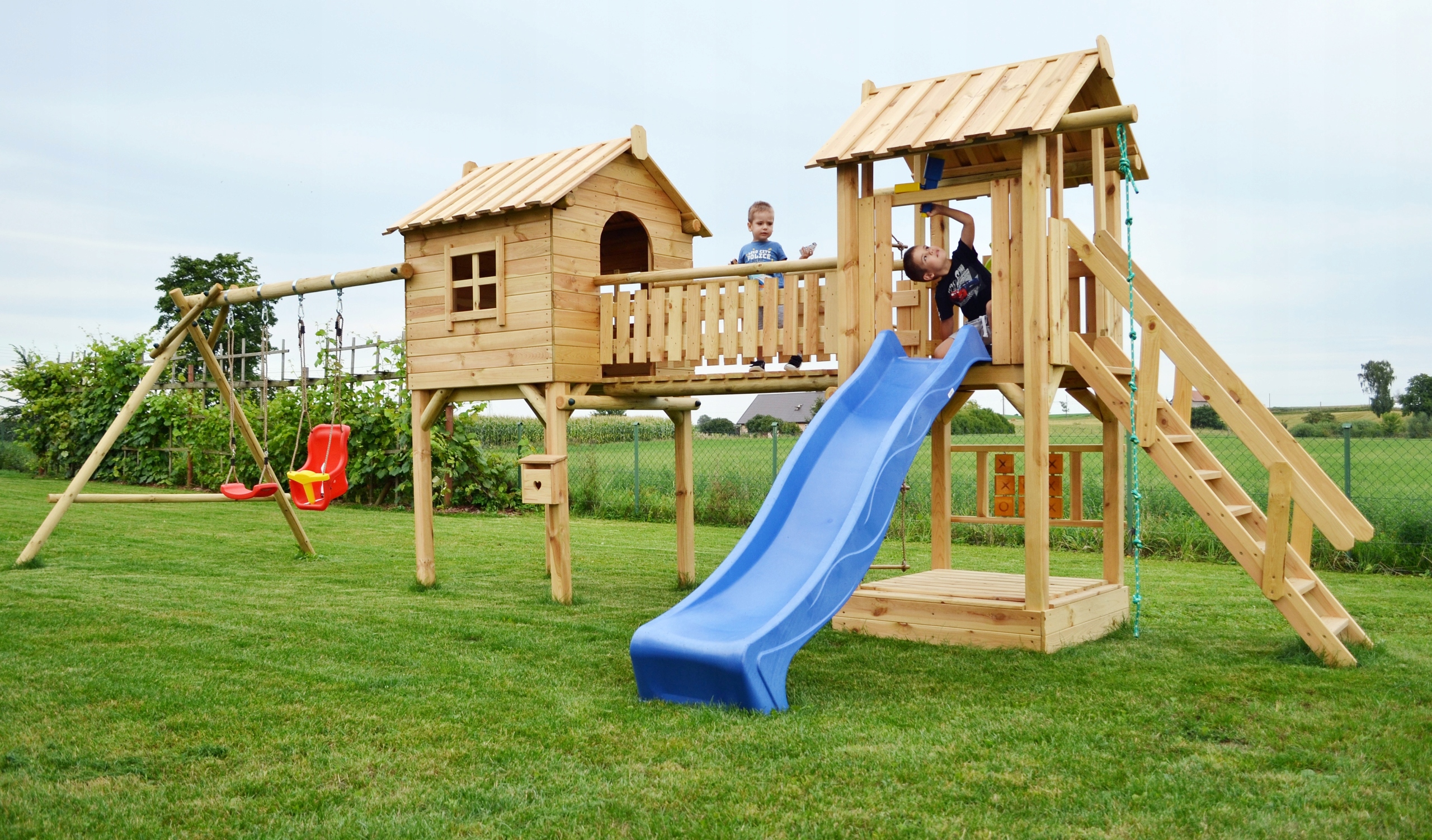 - Детская площадка полностью изготовлена из сушеной древесины сосны и ели.