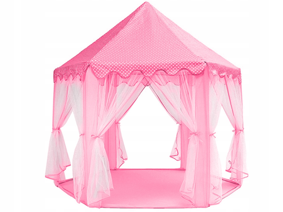 Палатка привлекает его глаза своим очаровательным внешним видом - шестью подготовленную основу, до шести входов и коническая крыша дает ему уникальный характер. Светло -розовый цвет с белым горохом добавляет легкость и девичье очарование, что делает его идеальным выбором для каждой маленькой принцессы.