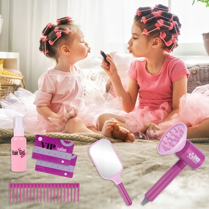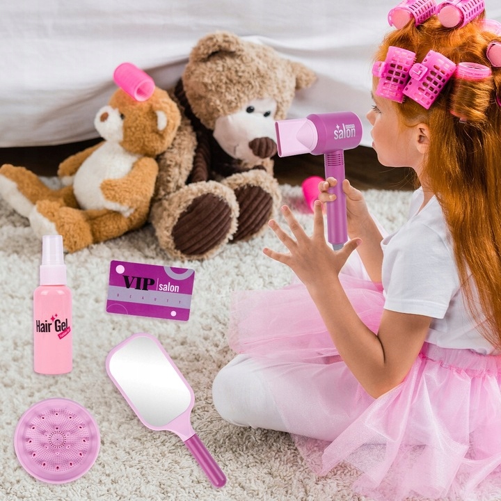 В комплект входит не только фен, но и расческа, зеркало, флакон с гелем для волос и дополнительные насадки для фена. Все это позволяет детям играть по самым разным сценариям, развивая воображение и мануальные навыки.