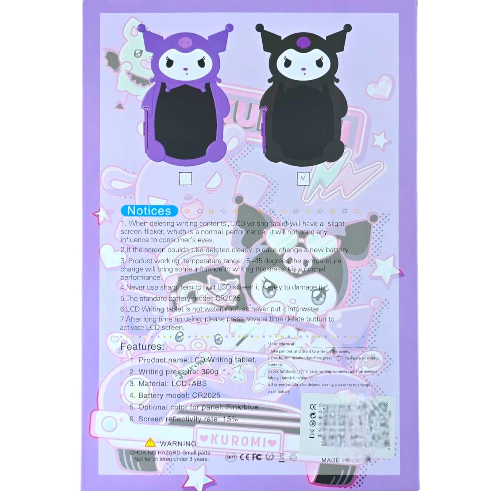 Привнесите волшебство рисования и обучения в повседневные игры вашего ребенка с помощью планшета для рисования из серии «Куроми»! Этот интерактивный гаджет — идеальное решение для детей, которые любят рисовать, делать заметки или учатся писать. Благодаря очаровательному дизайну в стиле Куроми планшет станет любимым компаньоном каждого ребенка.