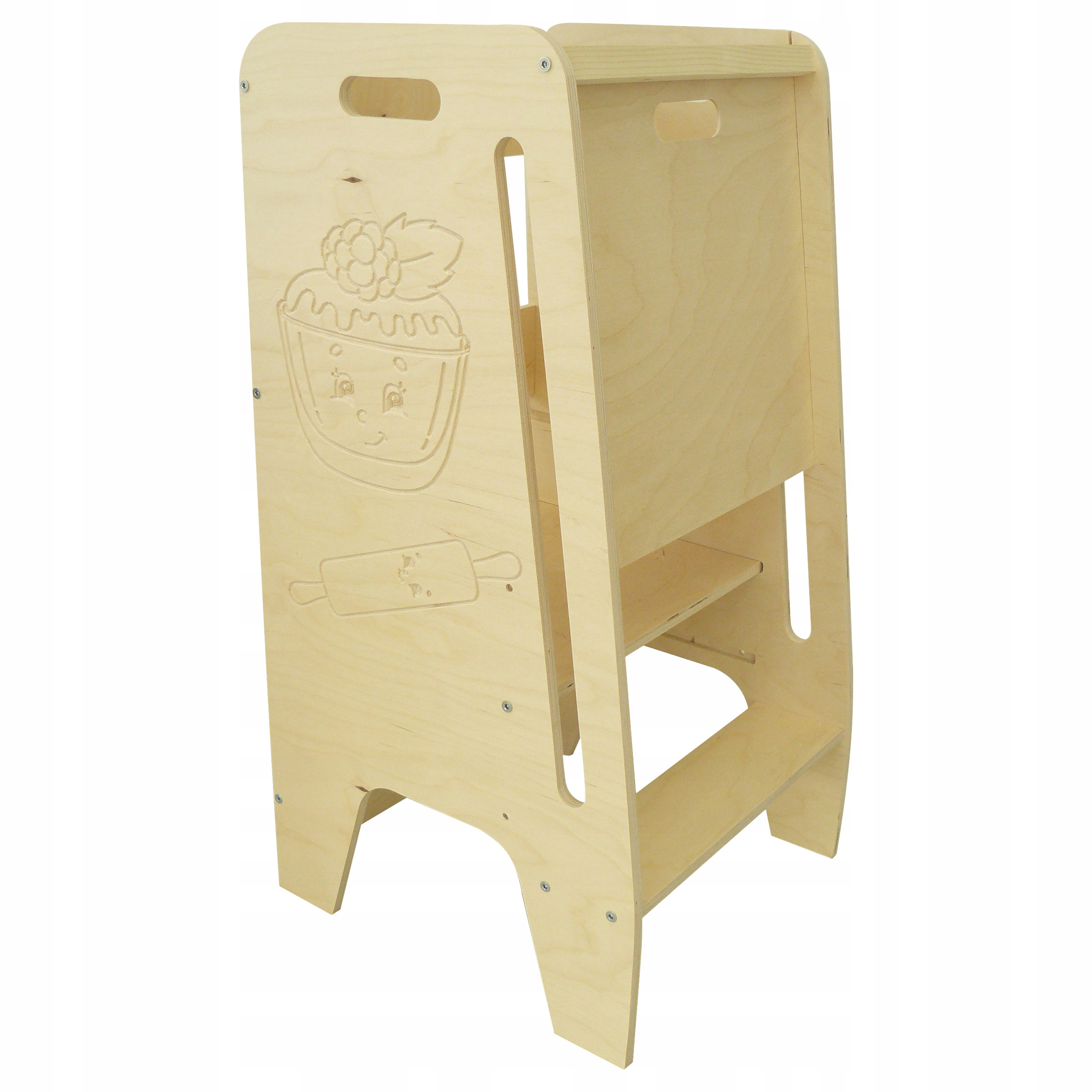 Изделие изготовлено из натуральной фанеры (не крашено). Мебель прочная и устойчивая. Его можно использовать для детей разного роста благодаря трехступенчатой регулировке высоты. Вход облегчается ступенькой высотой 15 см, а безопасность обеспечивается сдвижной пластиной. Наш помощник украшен с двух сторон гравировкой со скалкой и десертом с одной стороны и гравировкой с фартуком с другой.