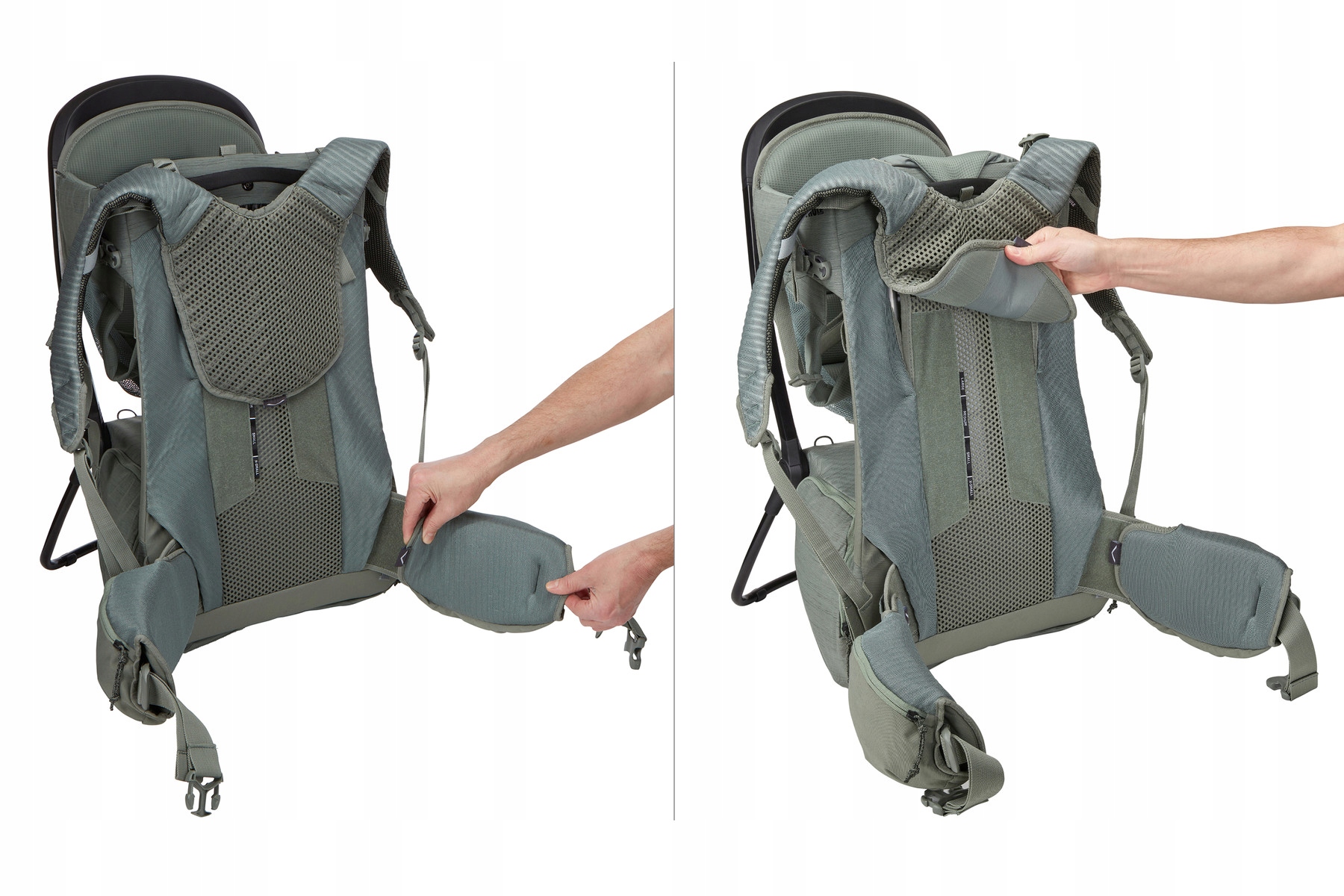 Полностью регулируемые передние и поясные ремни обеспечивают идеальную посадку, комфортную переноску и быструю передачу ребенка от родителя к родителю