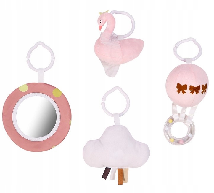 Игровой коврик имеет две арки, к которым прикреплены четыре игрушки. Погремушка, пищащая игрушка, мягкая игрушка и зеркало займут вашего малыша. Дополнительно игровой коврик оснащен пищалкой и бирками.
