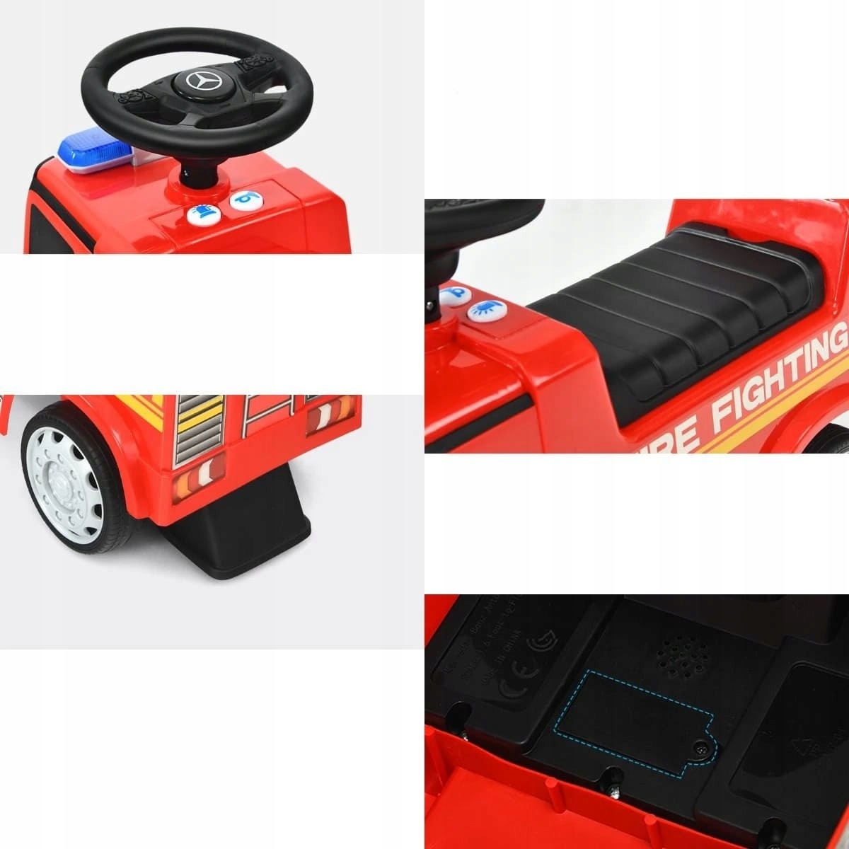 Благодаря огням, привлекательным звукам и эргономическому дизайну, наша игрушечная пожарная машина является идеальным выбором для детей от 12 до 36 месяцев. Прочный материал PP не наносит вреда здоровью детей. Стабильная металлическая рама обеспечивает стабильность и выдерживает нагрузку до 25 кг. Широкое и эргономичное сиденье очень удобно. Четыре не SLIP и устойчивые инструментальные колеса позволяют детям свободно двигаться.