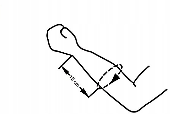 ЧТОБЫ ВЫБРАТЬ ПРАВИЛЬНЫЙ РАЗМЕР, НЕОБХОДИМО ИЗМЕРИТЬ ОБЪЕМ ПРЕДПЛЕЧЬЯ НА 15 СМ ОТ ЗАПЯСТЬЯ