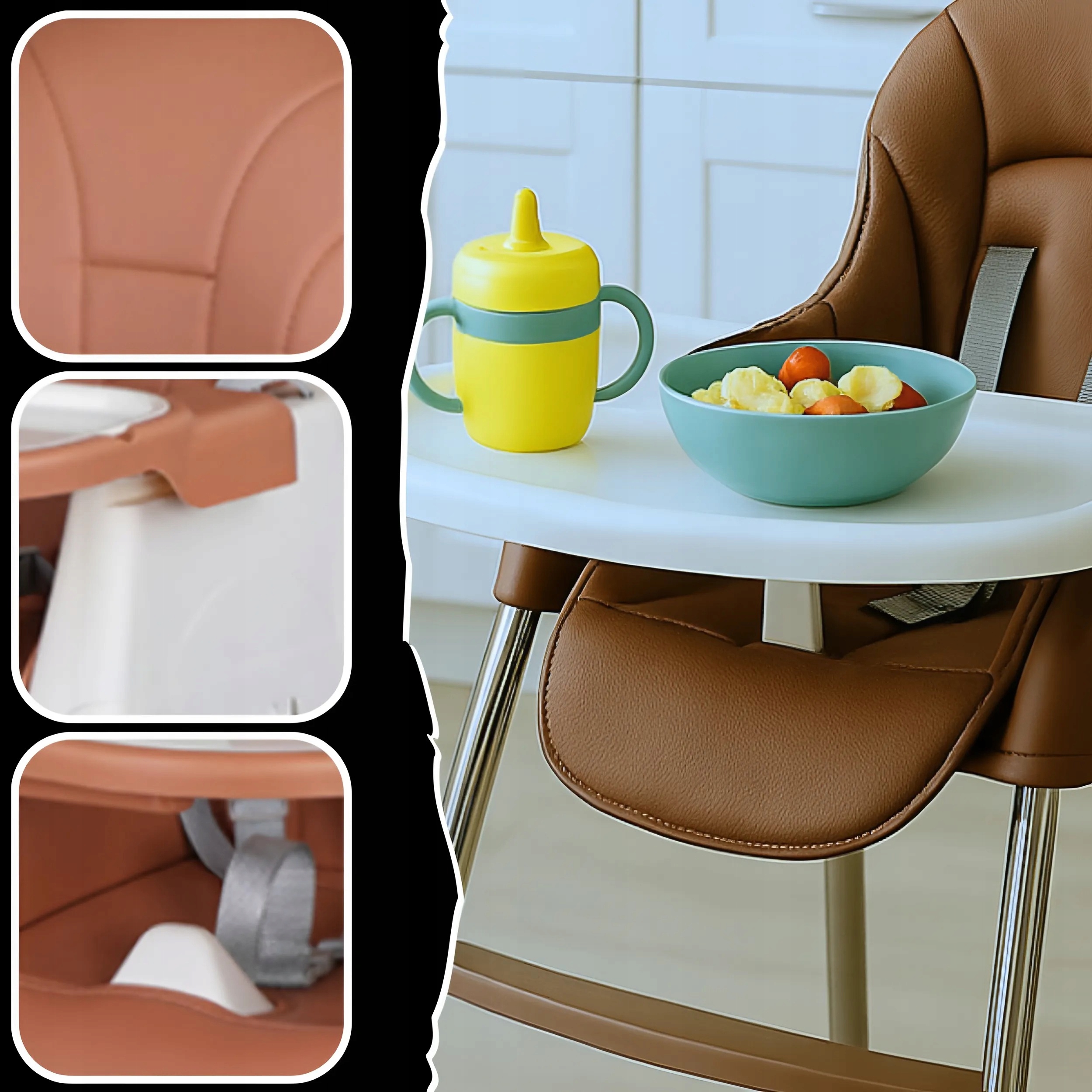 Стул 3IN1 - идеальное решение во время ежедневных приемов вашего ребенка. В кресле легкое, мягкое и простое в использовании. Стул подходит, когда ребенку 6 месяцев . Он имеет съемную обивку от практической кожи эко -кожи, которая легко чистить и удобно использовать. Верх имеет 3 уровня регулировки расстояния и съемный поднос. Дополнительное преимущество 4 не -скользящих футов с соответствующим расстоянием, обеспечивающим стабильность кресла. Дополнительный профилированный защитный элемент между ногами , не давая ребенку скользить со стула