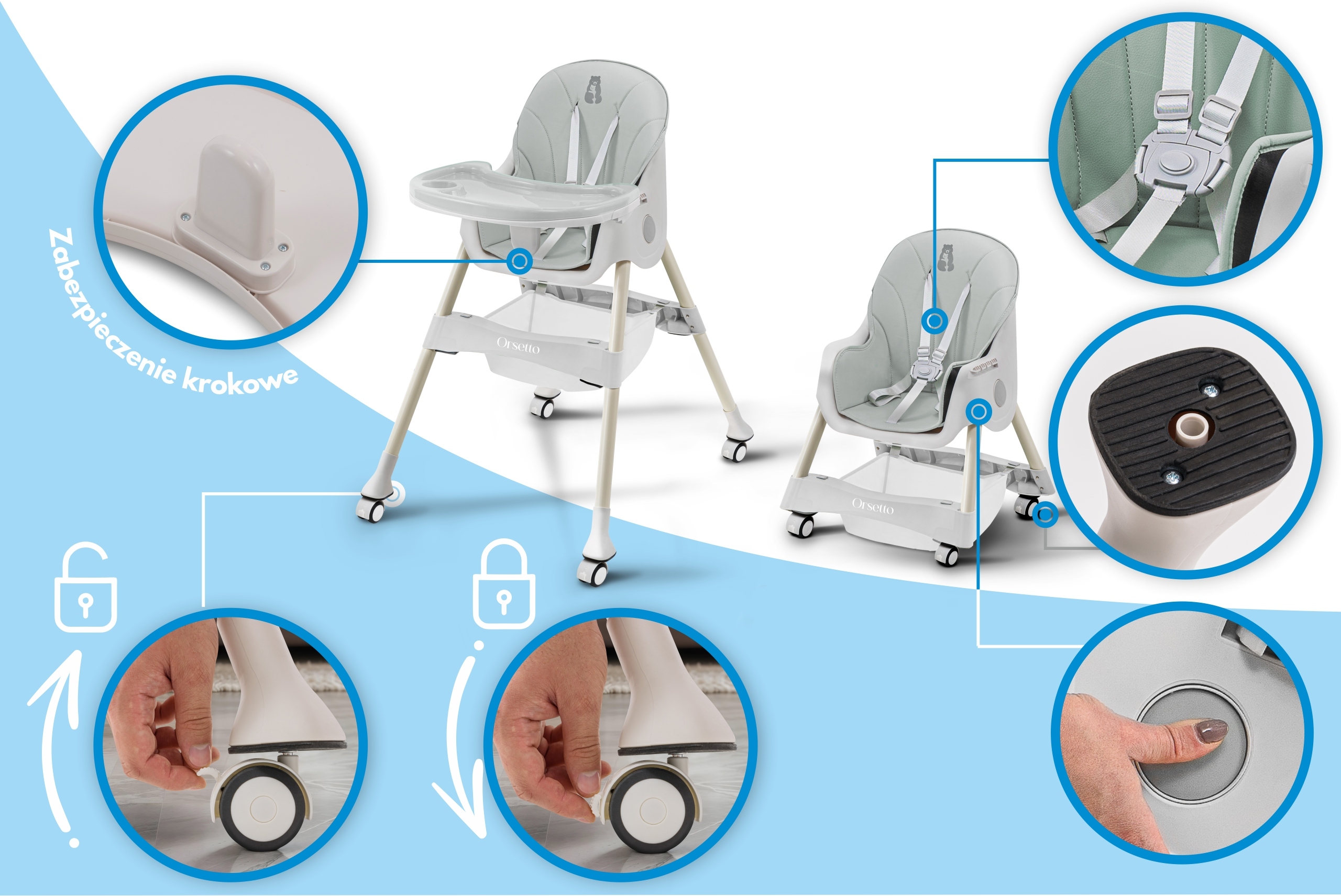 Стульчик для кормления ORSETTO KARMELEK оснащен многочисленными удобствами, облегчающими кормление и ежедневный уход за ребенком. Стульчик с подносом позволяет комфортно кормить малыша, когда он находится на одном уровне с родителями. В свою очередь, возможность демонтажа подноса и перемещения стула к столу позволяет принимать пищу вместе. Низкие конфигурации будут полезны, когда ребенок начинает самостоятельно ходить или ему нужен самостоятельный предмет мебели.