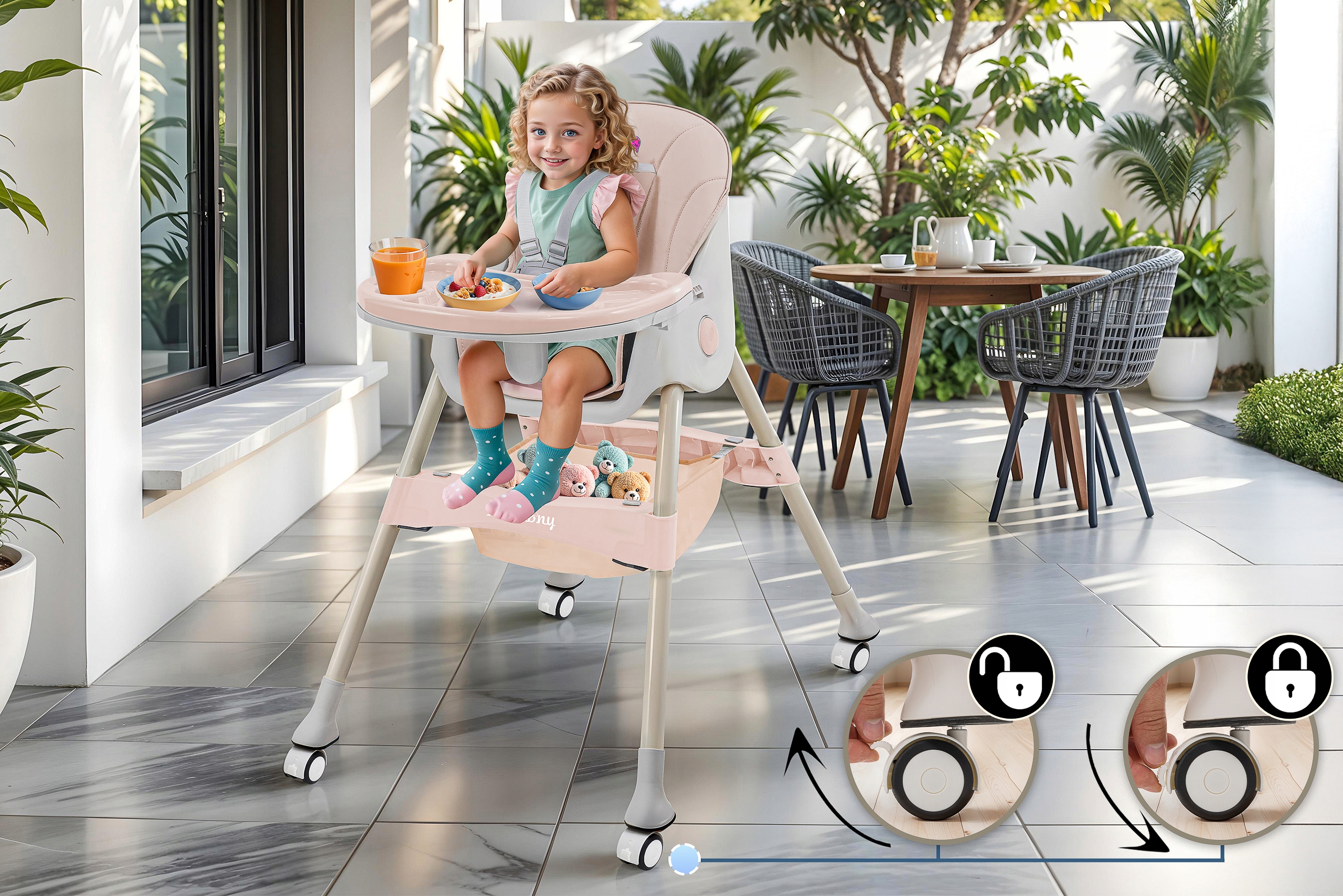 ⭐ ⭐ Cinnering оснащен съемными колесами с замком, что облегчает движение по всему дому. или сад, делая его стулом как внутри, так и снаружи Колесо гарантирует, что стул останется стабильным в выбранном месте, что еще больше повышает уровень безопасности. Ребенок с максимальным комфортом и стабильностью. Ребенок