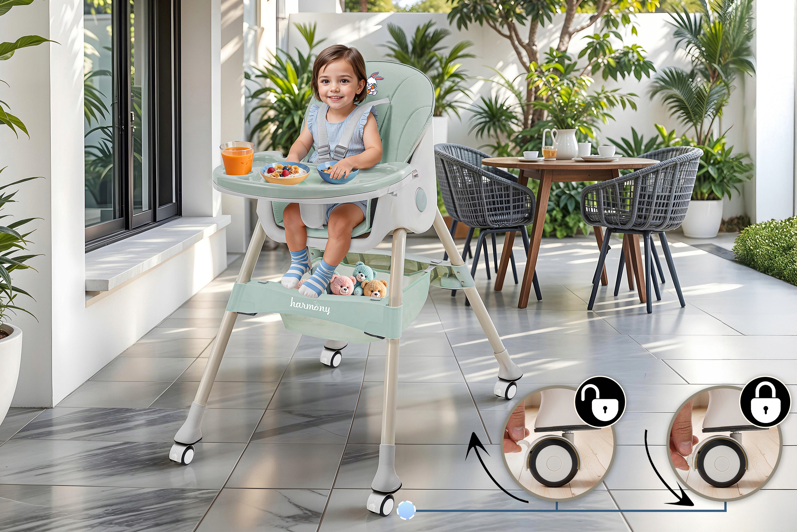 ⭐ ⭐ Cinnering оснащен съемными колесами с замком, что облегчает движение по всему дому. или сад, делая его стулом как внутри, так и снаружи Колесо гарантирует, что стул останется стабильным в выбранном месте, что еще больше повышает уровень безопасности. Ребенок с максимальным комфортом и стабильностью. Ребенок