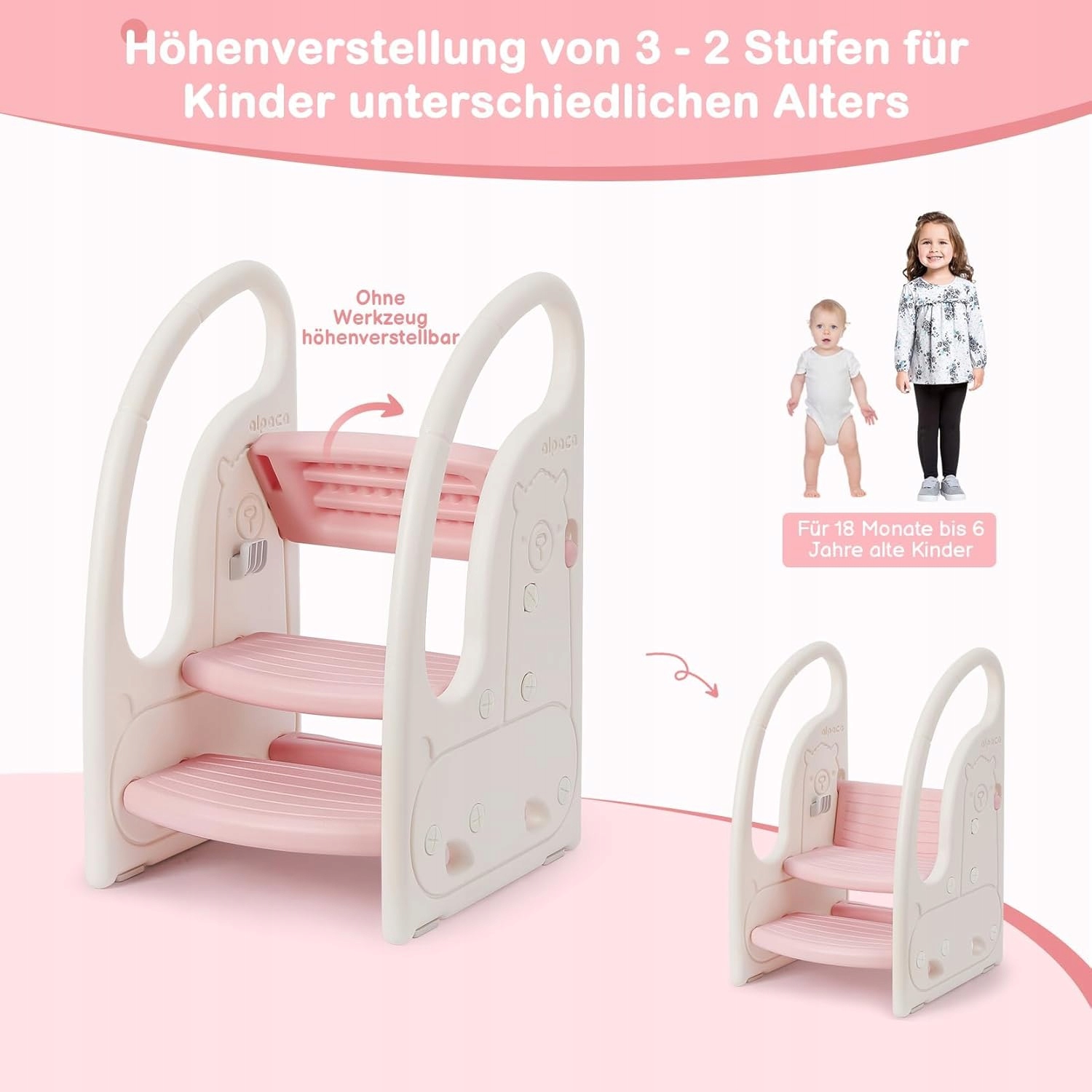 Прочный, нескользящий, но легкий: прочная конструкция «А», нескользящие педали и накладки, а также нескользящие двойные подлокотники обеспечивают тройную устойчивость и безопасность. Тем не менее, табурет очень легкий, поэтому дети могут без особых усилий перемещаться из одной комнаты в другую. Благодаря этому они могут быть по-настоящему независимыми!