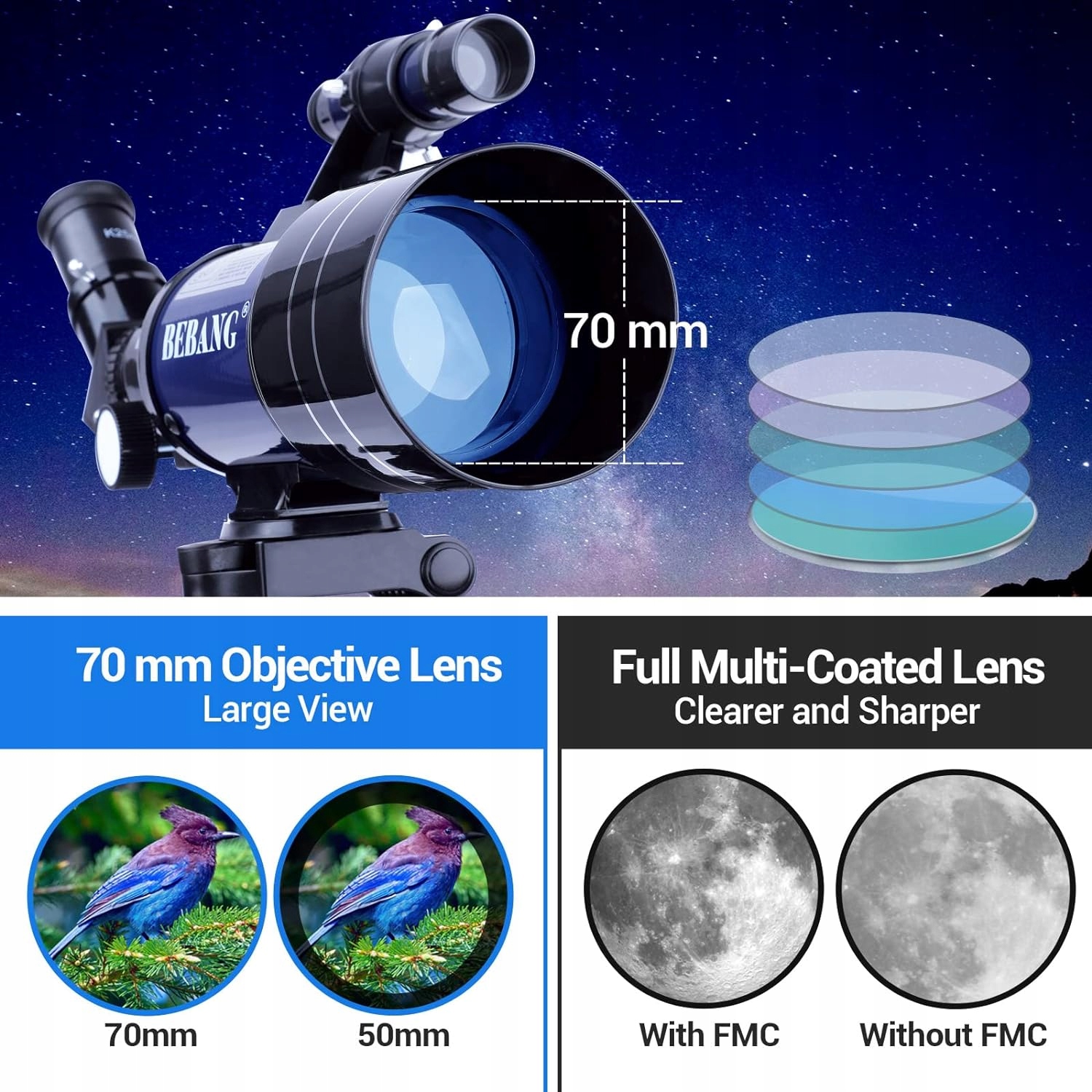 Объектив 70 мм, большой обзор. Линзы с полным многослойным покрытием, высокая прозрачность, улучшают яркость и прозрачность изображения. Астрономический телескоп, оснащенный лунным фильтром и выдвижным алюминиевым штативом, уменьшает блики, повышает качество и стабильность изображения.