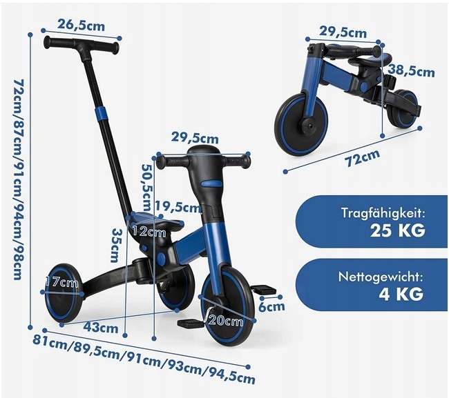 Детский трехколесный велосипед 4 в 1: Чтобы этот детский трехколесный велосипед сопровождал вашего ребенка в беззаботное детство, его можно легко использовать в 4 различных режимах: как коляска, детский трехколесный велосипед, обучающий велосипед, а также детский беговел. Таким образом, навыки равновесия со временем стабилизируются, и вы сможете научить ребенка кататься на велосипеде.