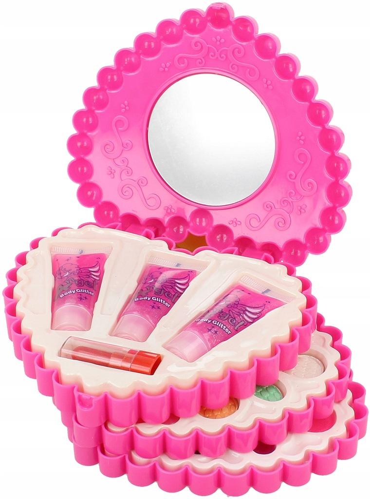 Косметический набор в форме замкнутого сердца макияжа для девочек, которые заинтересованы в косметике. Это идеально, чтобы начать приключение с визы! Он имеет широкий спектр аксессуаров в разных цветах, которые позволили бы ребенку создавать любую стилизацию. Удобные, скользящие полки позволят вам иметь все аксессуары