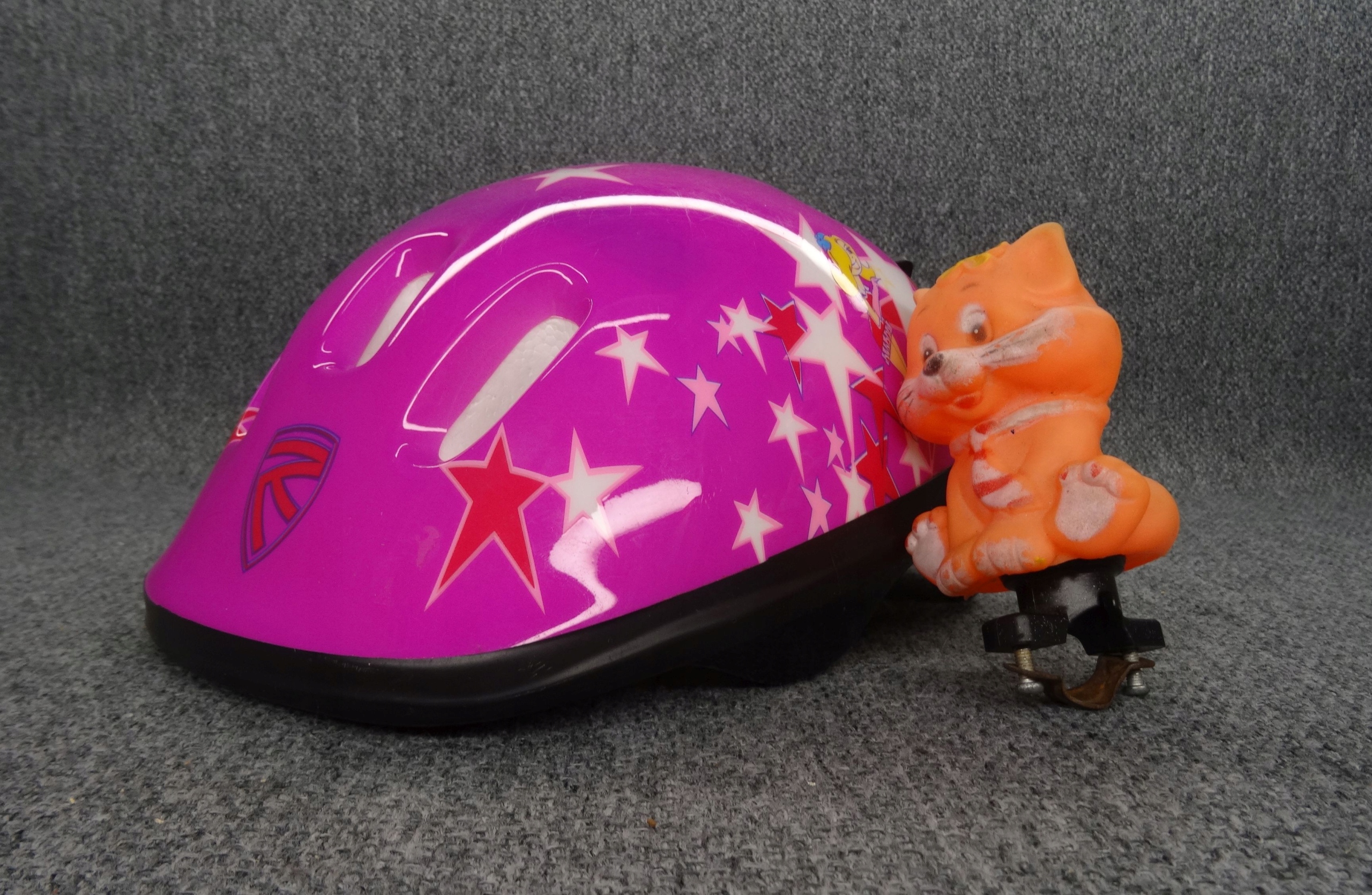 велосипедный детский шлем + резиновый рог. Шлем из пенопласта снаружи, покрытый пластиком. Китайский продукт.