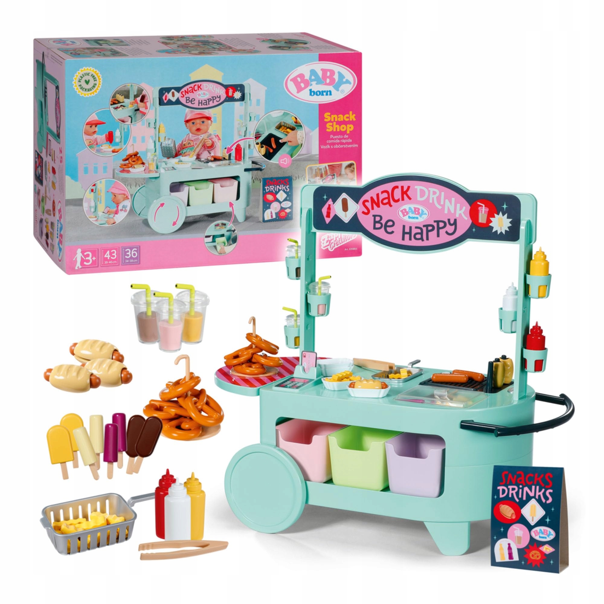 Baby Born A A Trolley с закусками - идеальная игрушка для небольших исследователей. Красочный дизайн и многочисленные аксессуары обеспечат часы творческих развлечений. Коляска легкая и легко водить благодаря подвижным колесам.