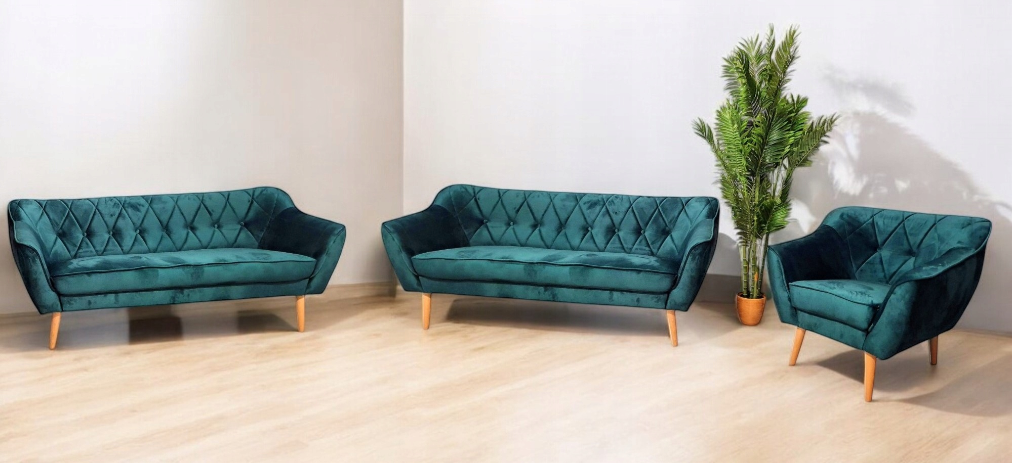 твердое красивое скандистское скандав. h1> твердый диван 3 + 3 +1 зеленого цвета с деревянными черными ногами, узор кнопки каро. (Доплата)