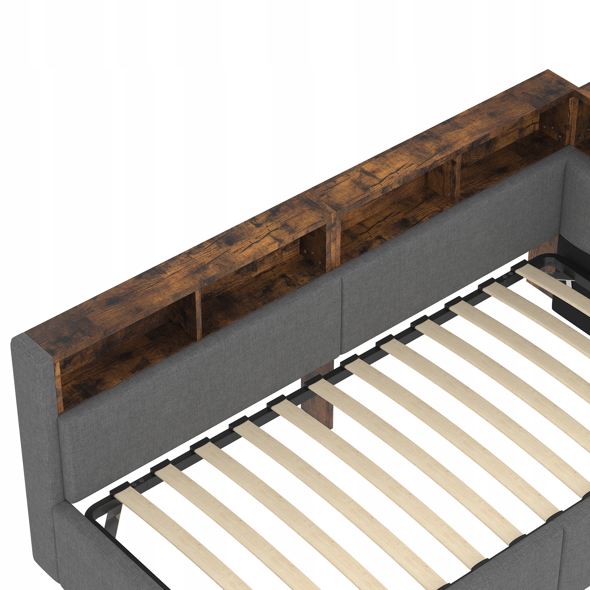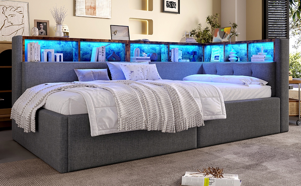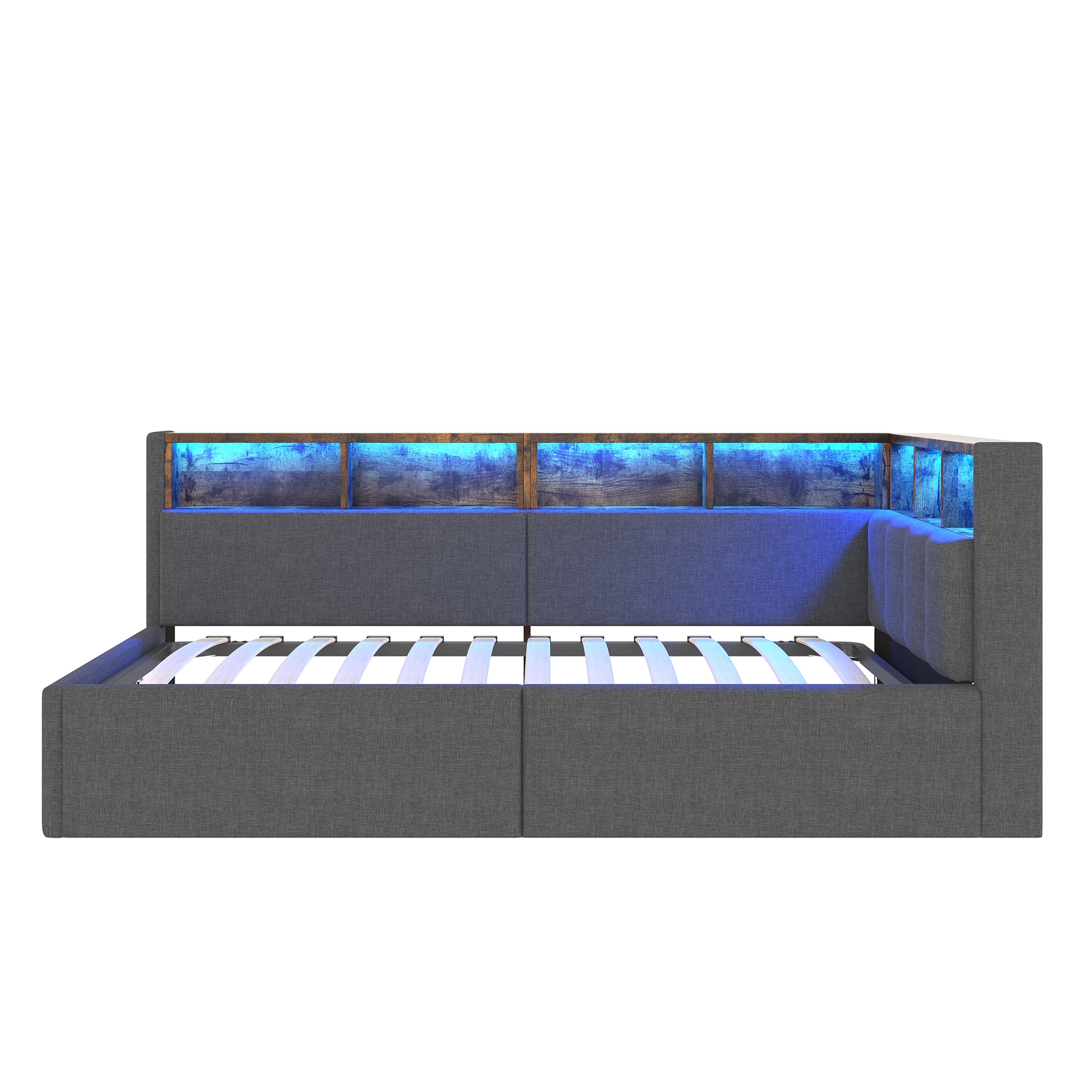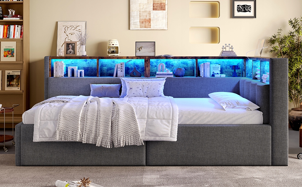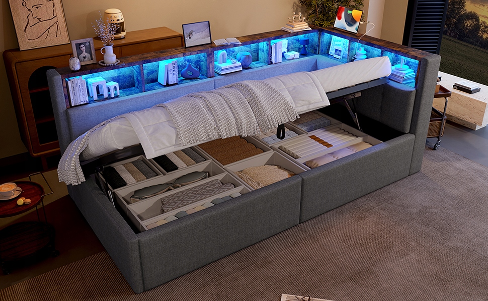 Диван раскладной, 90×200 см, порты USB+ Type-C, гидравлическая функция хранения, много отделений, с многоцветной светодиодной подсветкой, без матраса, белье, серый